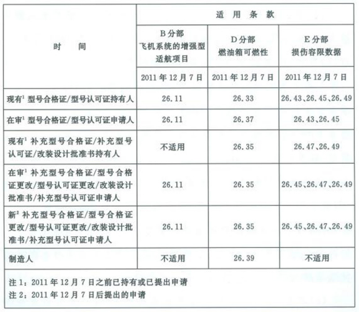 (2)在2011年12月7日前提出补充型号合格证/补充型号认可证/改装设计批准书或型号合格证/型号认可证更改申请,但在2011年12月7日前尚未获得批准的设计成通常为空的燃油箱;和