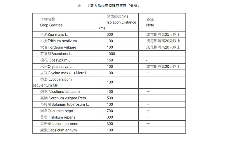 采用一般的生物隔离方法,将试验控制在必需的范围内。部分转基因作物田间隔离距离见表1;