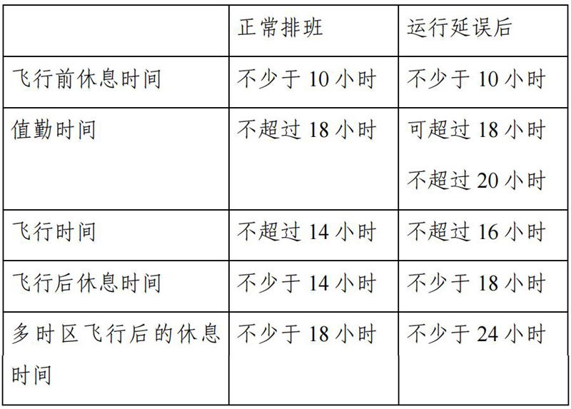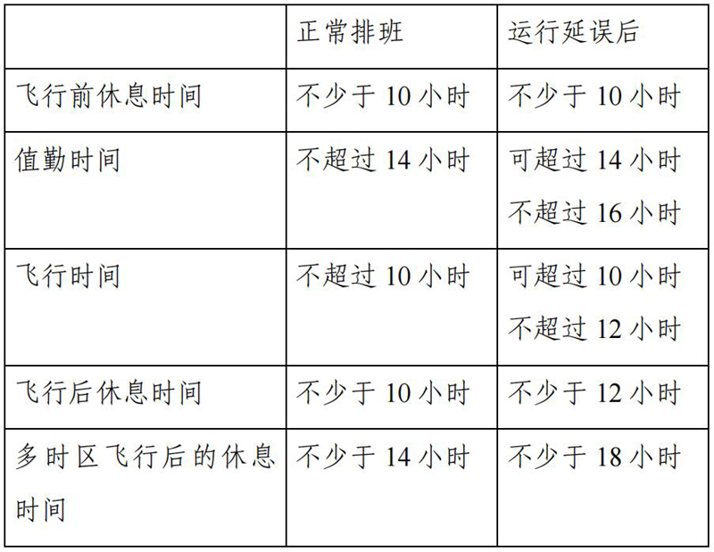(b)对于含一名或两名驾驶员的飞行机组,其飞行、值勤和休息时间安排应当满足下列表格中的要求: