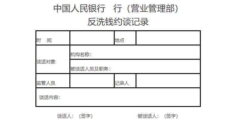 约见谈话时,中国人民银行及其分支机构反洗钱工作人员不得少于2人。谈话结束后,应当填写《反洗钱约谈记录》(附5)并经被谈话人签字确认。