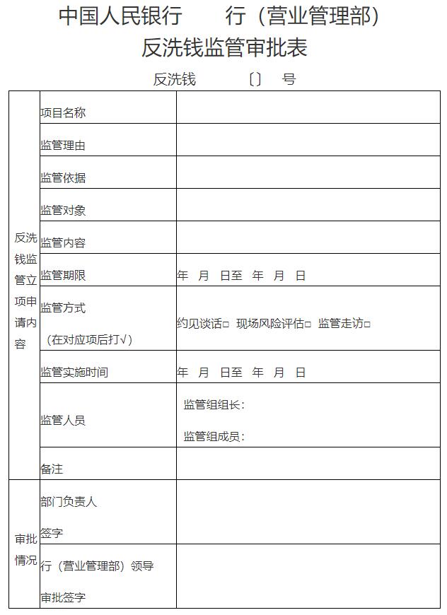 中国人民银行及其分支机构开展现场风险评估应当填制《反洗钱监管审批表》(附1)及《反洗钱监管通知书》(附2),经本行(营业管理部)行长(主任)或者分管副行长(副主任)批准后,至少提前5个工作日将《反洗钱监管通知书》送达被评估的金融机构。