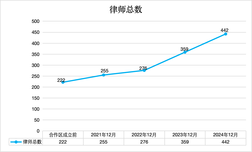 合作区成立至2024年12月,律师总数由222人增至442人,增幅99%。