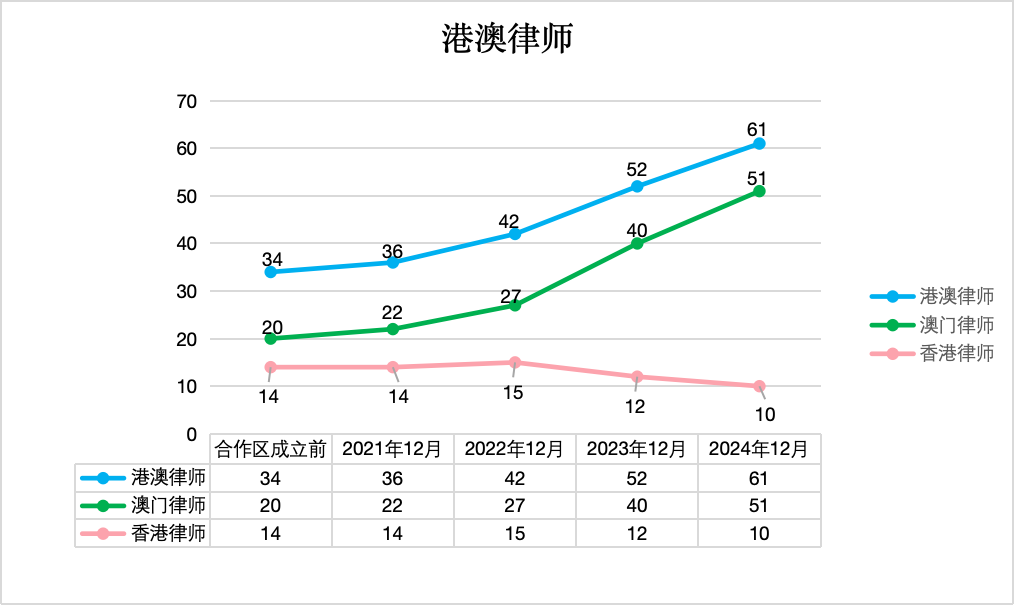 合作区成立至2024年12月,澳门律师由20人增至51人,增幅155%。