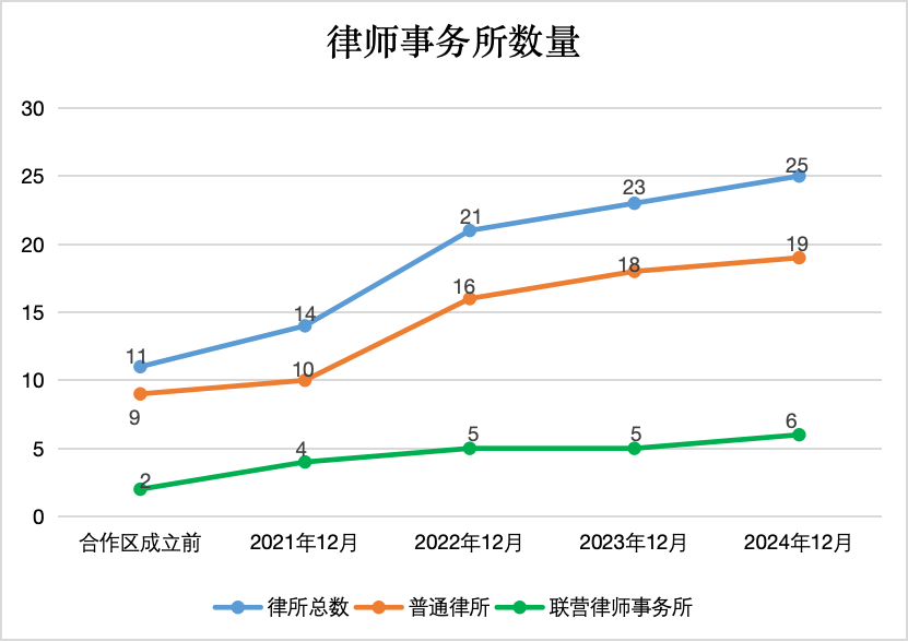 合作区成立至2024年12月,律师事务所由11家增至25家,增幅127%。
