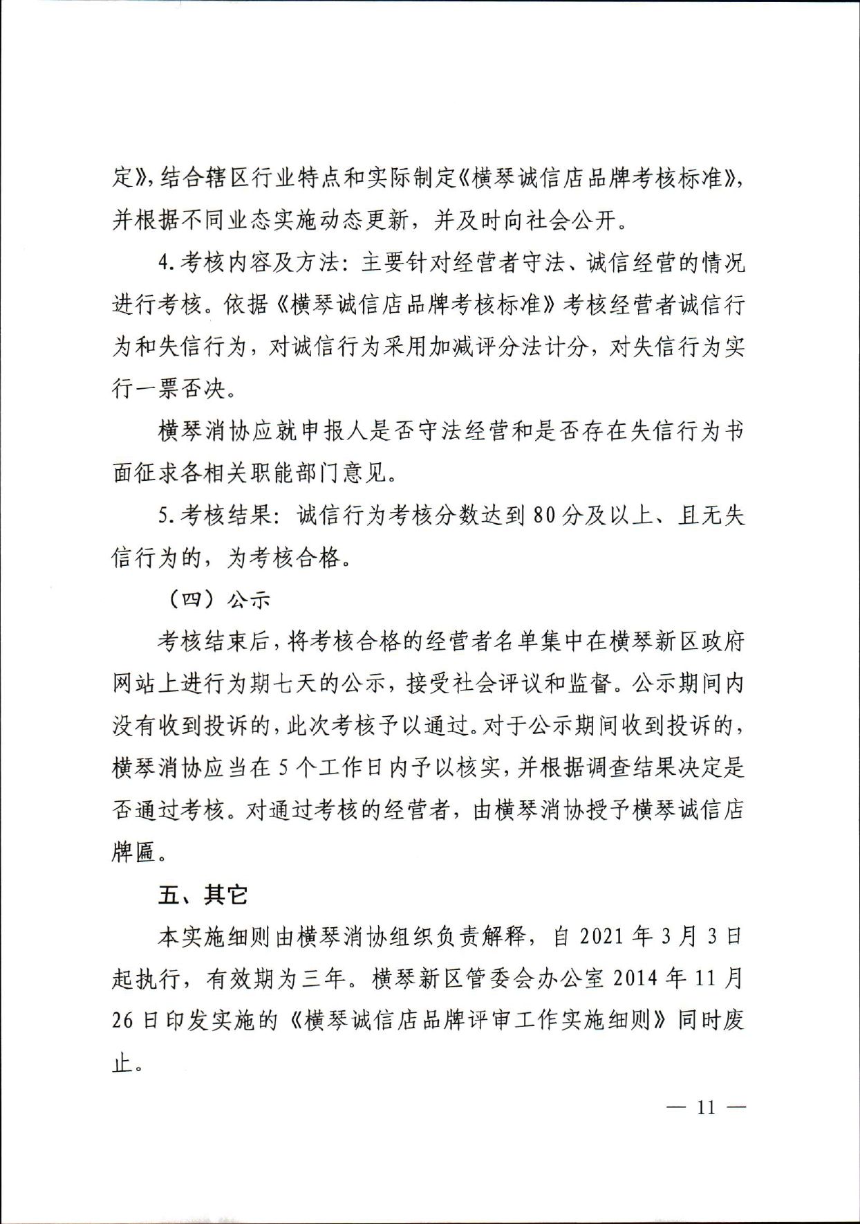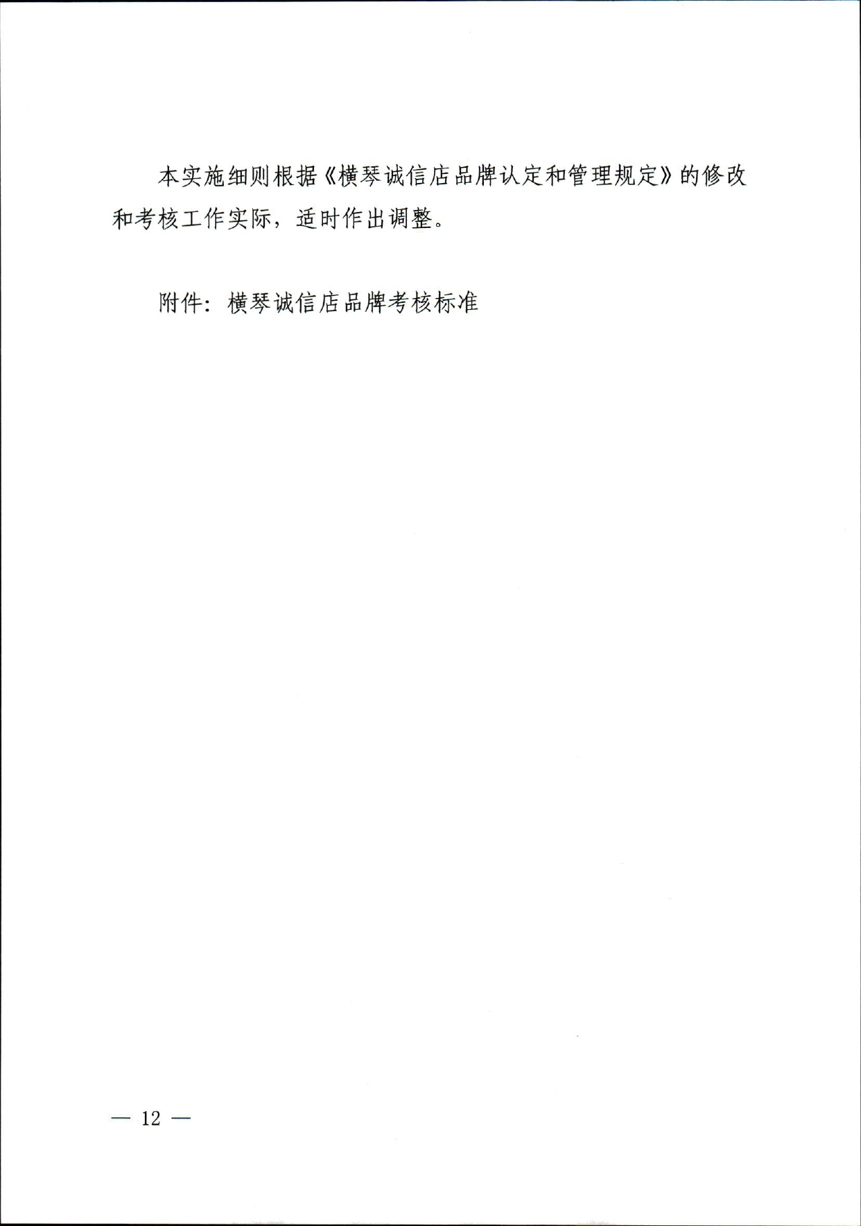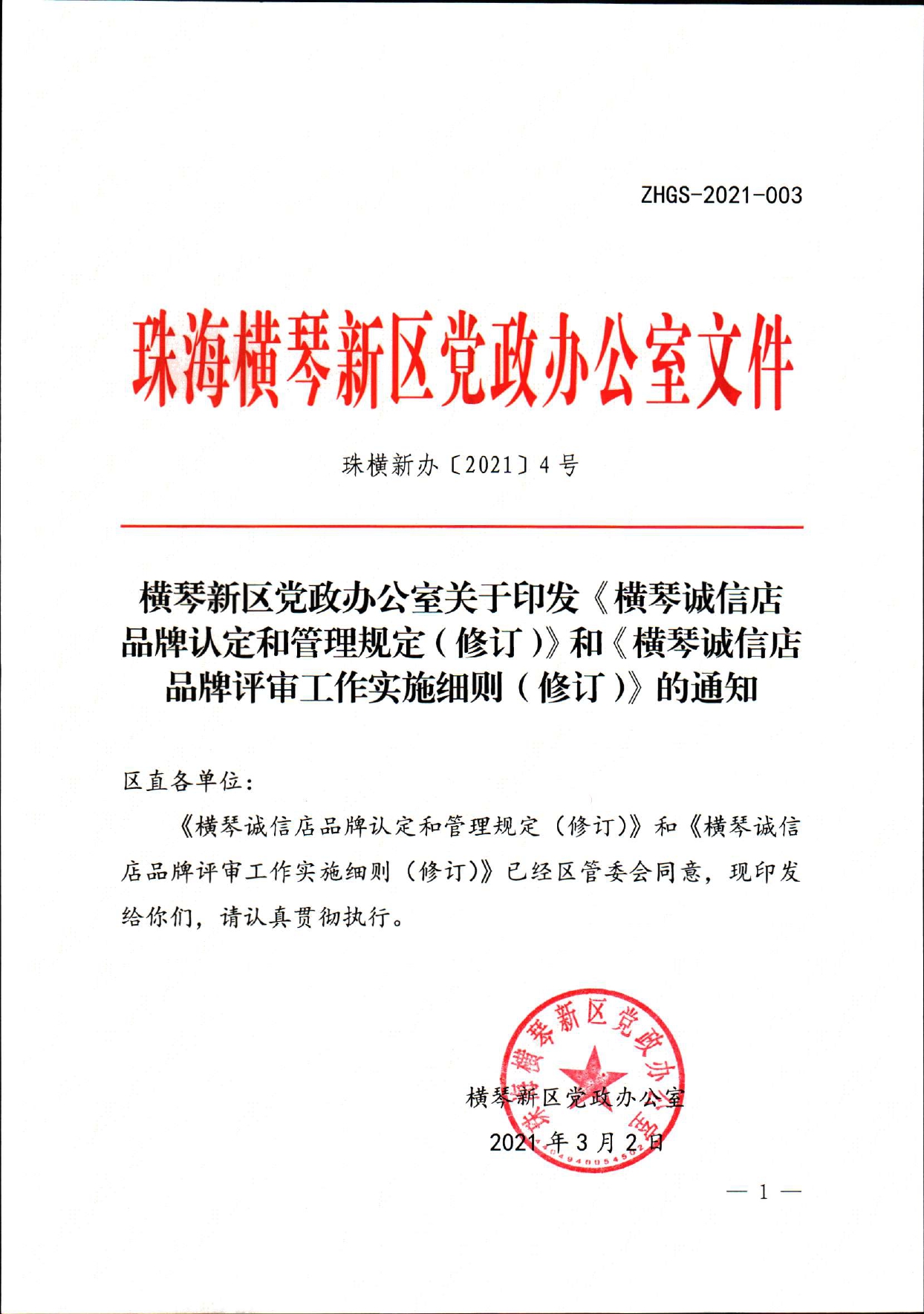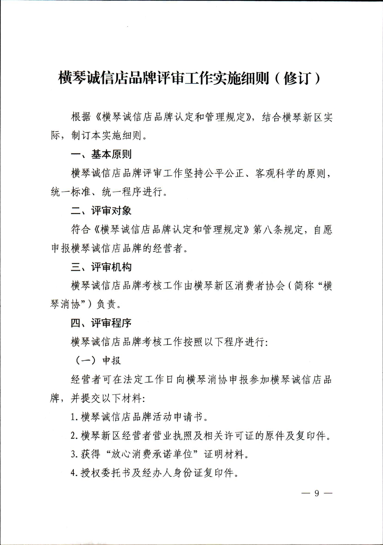 横琴新区党政办公室关于印发《横琴诚信店品牌认定和管理规定(修订)》和《横琴诚信店 品牌评审工作实施细则(修订)》的通知