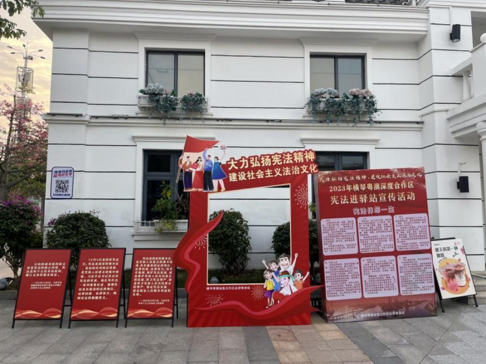 宪法是国家的根本法,是治国安邦的总章程。2023年12月4日是第十个国家宪法日,也是我国现行宪法颁布施行四十一周年。为学习宣传贯彻党的二十大精神,大力弘扬宪法精神,建设社会主义法治文化,在2023年“宪法宣传周”期间,横琴粤澳深度合作区法律事务局(下称法律事务局)统筹相关单位开展“1+5+2”系列宪法宣传活动,通过“宪法集中宣传”“宪法进单位”“宪法进校园”“宪法进社区”“宪法进口岸”“宪法进驿站”“宪法进网络”以及“宪法精神点亮城市地标”等一系列宣传推广活动,在横琴粤澳深度合作区形成了热烈的宪法宣传和学习氛围,进一步增强宪法意识、弘扬宪法精神、维护宪法权威,推动宪法知识家喻户晓、宪法理念深入人心。