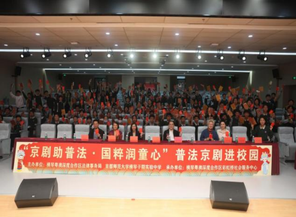 在合作区中小学校园里,法律事务局联合民生事务局组织开展了一系列“宪法进校园”活动,包括将宪法教育融入升旗仪式、宪法晨读、主题班会等实践活动,发动学生围绕国家宪法日主题,制作宣传海报、手抄报,培育学生的宪法意识、国家意识、规则意识,营造浓厚的宪法宣教氛围。通过相声和京剧等表现形式,邀请京剧老师进行普法表演,寓教于乐,分别在横琴一中,子期学校等试点开展“国粹进校园”活动,通过以京剧、相声等中华优秀传统文化的艺术表现形式,创新融合了宪法等法治等知识的剧场表演,“国粹进校园”活动收到全体师生热烈参与。