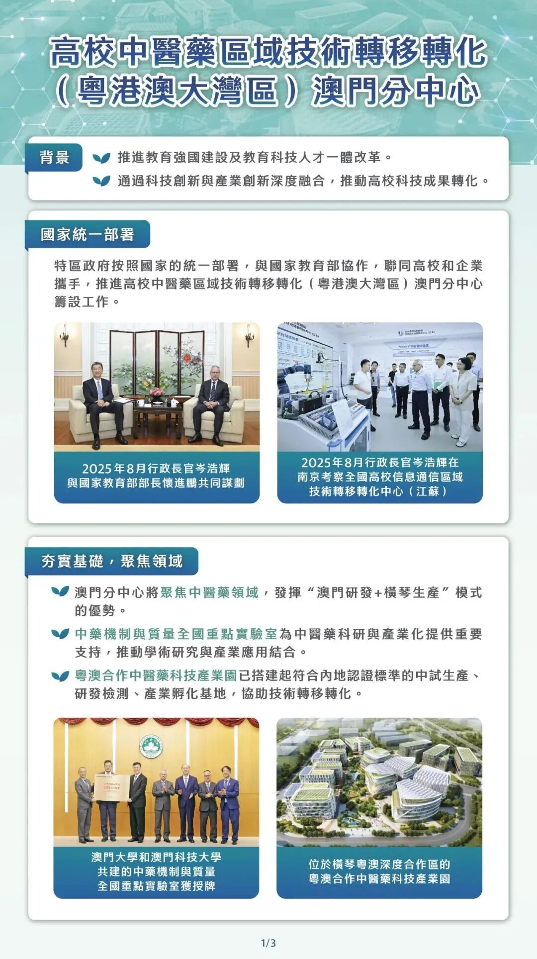 为加速创新成果的集聚与转化,澳门特区政府积极筹建高校中医药区域技术转移转化(粤港澳大湾区)澳门分中心,将连结内地与澳门中医药头部高校的科研团队和企业,并善用澳门高校全国重点实验室和合作区珠海澳大科技研究院等科技平台,建设服务与实验平台,联动政、产、学、研、金的力量,全力支援中医药大健康产业发展,实现科研成果从“书架走到货架”,并以“澳门注册+横琴生产”模式,推动优质的中药产品进入国际市场,全球销售。