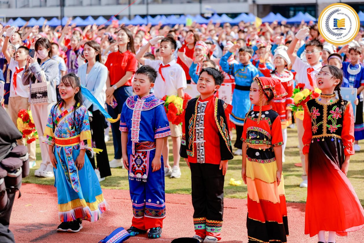 开幕式上,56名身着各民族服饰的学生簇拥着五星红旗缓缓前行,“南海前哨钢八连”官兵庄重升旗。紧接着,横琴子期小学、澳门浸信中学和澳门培正中学的学生代表共同领唱《歌唱祖国》。普通话与粤语交融的歌声响彻云霄,琴澳师生用同一种情感表达对祖国的热爱。
