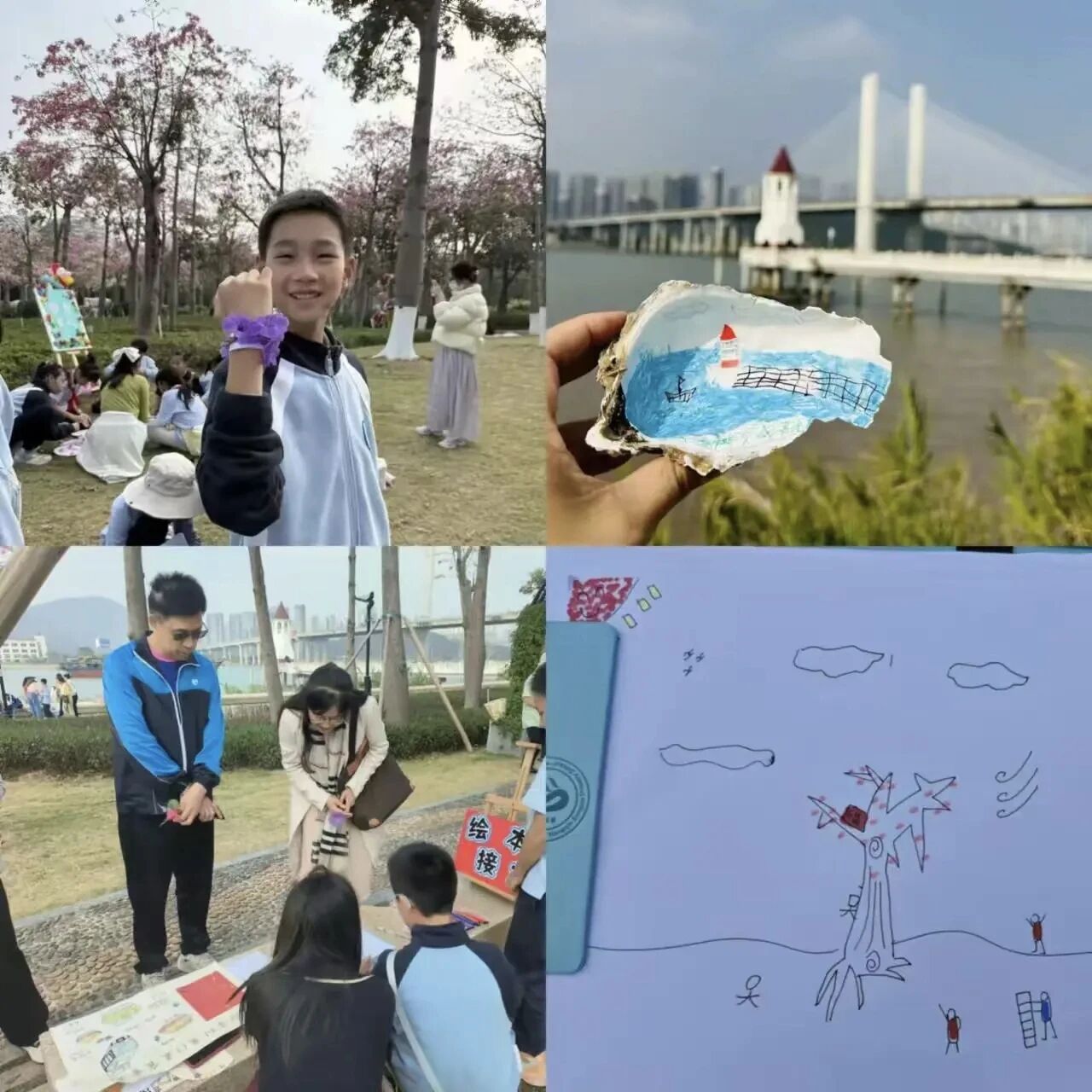 2024年12月,两校学生在横琴花海长廊开展生态研学活动。他们混合分组,通过“指尖花海”“蚝壳艺术”等打卡闯关活动深化协作,最终绘制出一幅5米长卷,描绘琴澳风光。