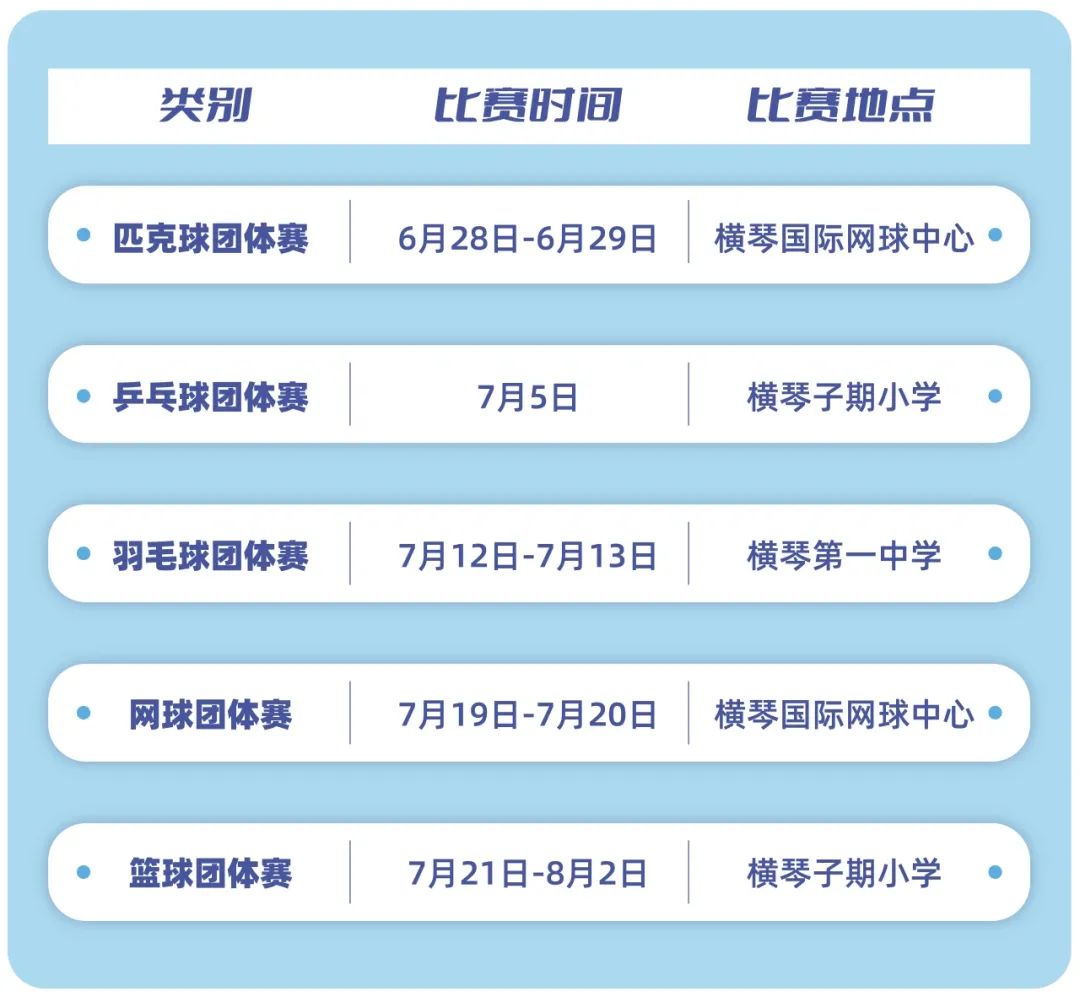匹克球团体赛的成功举办,为2025“琴澳杯”系列赛暨青少年系列赛创造了良好的开端。接下来,从7月5日至8月2日,每周将分别迎来乒乓球、羽毛球、网球、篮球四项团体赛事。