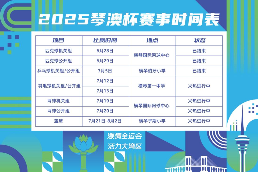 体育的激情仍在延续,乒乓球团体赛的落幕标志着“琴澳杯”系列赛进入下一阶段,接下来,从7月12日至8月2日,每周将分别迎来羽毛球、网球和篮球团体赛事。