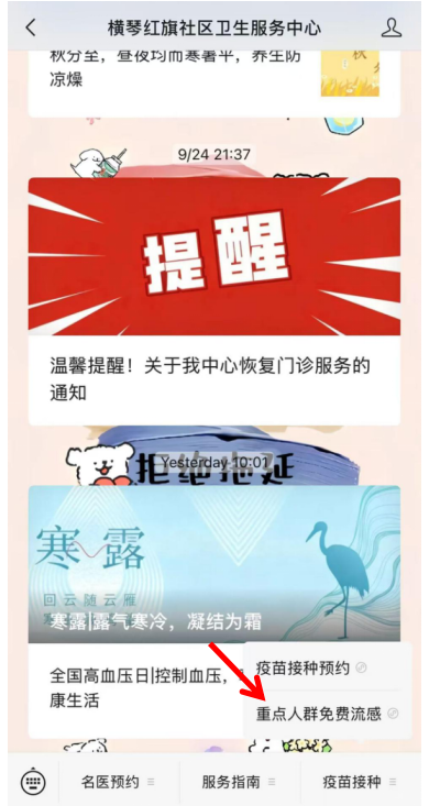 关注“横琴红旗社区卫生服务中心”微信公众号,选择“疫苗接种”-“重点人群免费流感”进行预约,请按预约时间前往接种,避免人群扎堆,延长等候时间。
