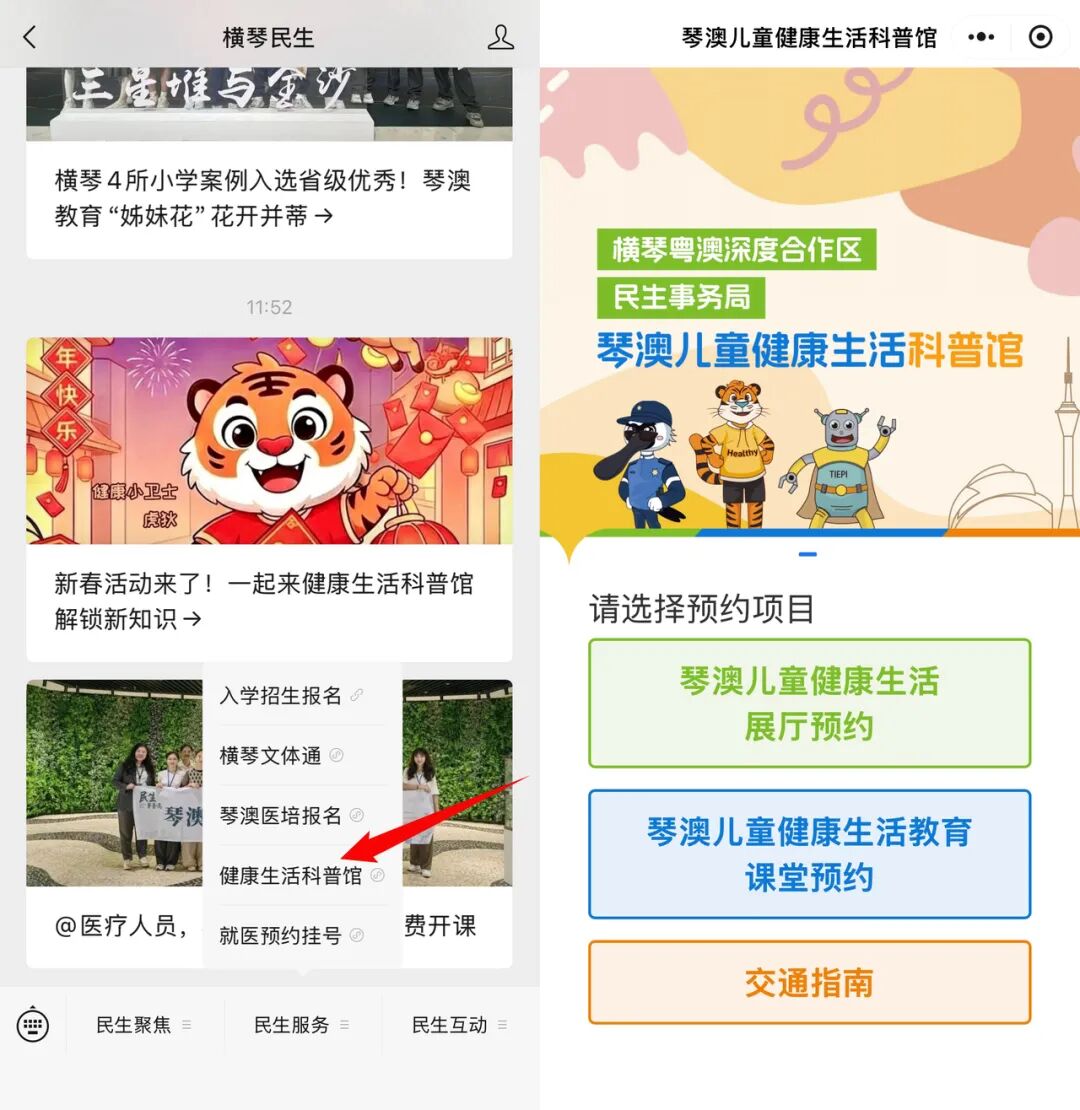 关注“横琴民生”微信公众号,在“民生服务”菜单点击“健康生活科普馆”进入预约平台;