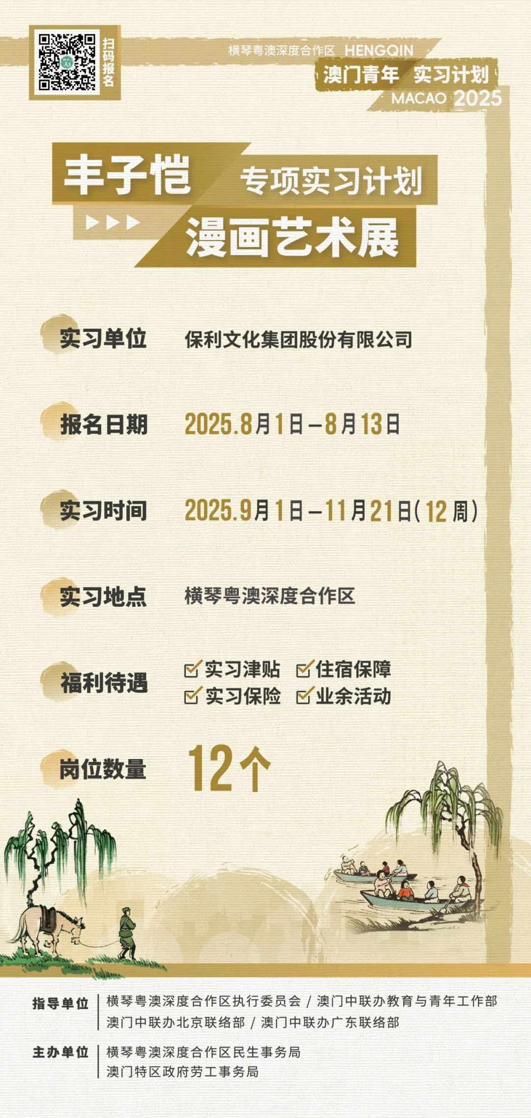 为配合“1+4”经济适度多元发展策略,培育文旅会展产业人才,横琴粤澳深度合作区民生事务局(下称“合作区民生事务局”)与澳门特别行政区政府劳工事务局(下称“澳门劳工局”)以及保利文化集团股份有限公司(下称“保利文化”),共同推出“2025丰子恺漫画艺术展专项实习计划”(下称“实习计划”)。