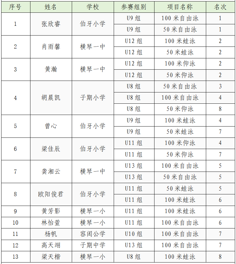 面对全省少儿游泳精英,横琴小将们愈战愈勇,经过全天紧张激烈的角逐,横琴青少年游泳队再创辉煌,最终以绝对优势斩获33个单项前八名,其中11枚金牌、8枚银牌、4枚铜牌,金牌数领跑赛场。