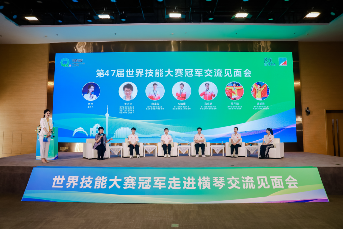Os campeões do 47º Campeonato Mundial de Habilidades, Yao Nijun (Tecnologia de Apresentação de Produtos), Zhou Qinfu (Tecnologia da Moda), Ma Zhenpeng (Desenvolvimento de Aplicativos Móveis), Fang Canhao e Jiang Jiajun (Robótica Móvel Autônoma), juntamente com concorrentes de Macau, se comunicaram face a face com quase 200 jovens estudantes de Zhuhai, Macau e Hengqin, compartilhando suas experiências de crescimento e competições.