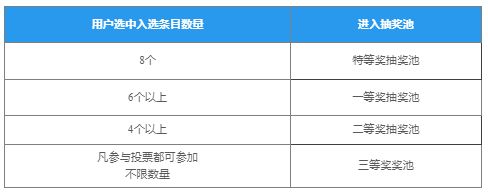 主办方将在参与投票的微信用户中进行抽奖,选中对应数量入选条目,进入对应抽奖池抽取相对应奖品。
