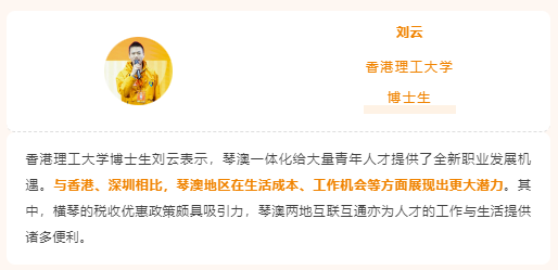 据了解,合作区自成立以来,为加速创新要素、高素质人才的加快集聚,出台了系列具有竞争力和横琴特色的人才发展支持政策,包括“双15%”税收优惠政策、人才生活补贴、创新创业扶持等,邀请广大毕业生参与合作区建设发展进程,与合作区共享发展机遇。