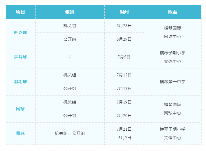 本届“琴澳杯”系列赛设机关组、公开组,涵盖乒乓球、匹克球、篮球、羽毛球、网球项目,均以团体赛的形式参赛,吸引了琴澳两地居民、职工、学生的广泛关注和踊跃参与。