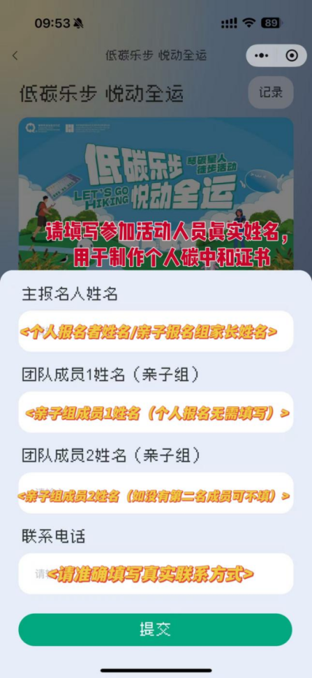 活动可以个人/亲子形式报名。亲子报名只需由主账号代表统一报名(请填写所有参与活动的家庭成员信息,每组可报名2-3人)。注意:请填写真实姓名和联系电话,用于制作碳中和证书以及活动联系。