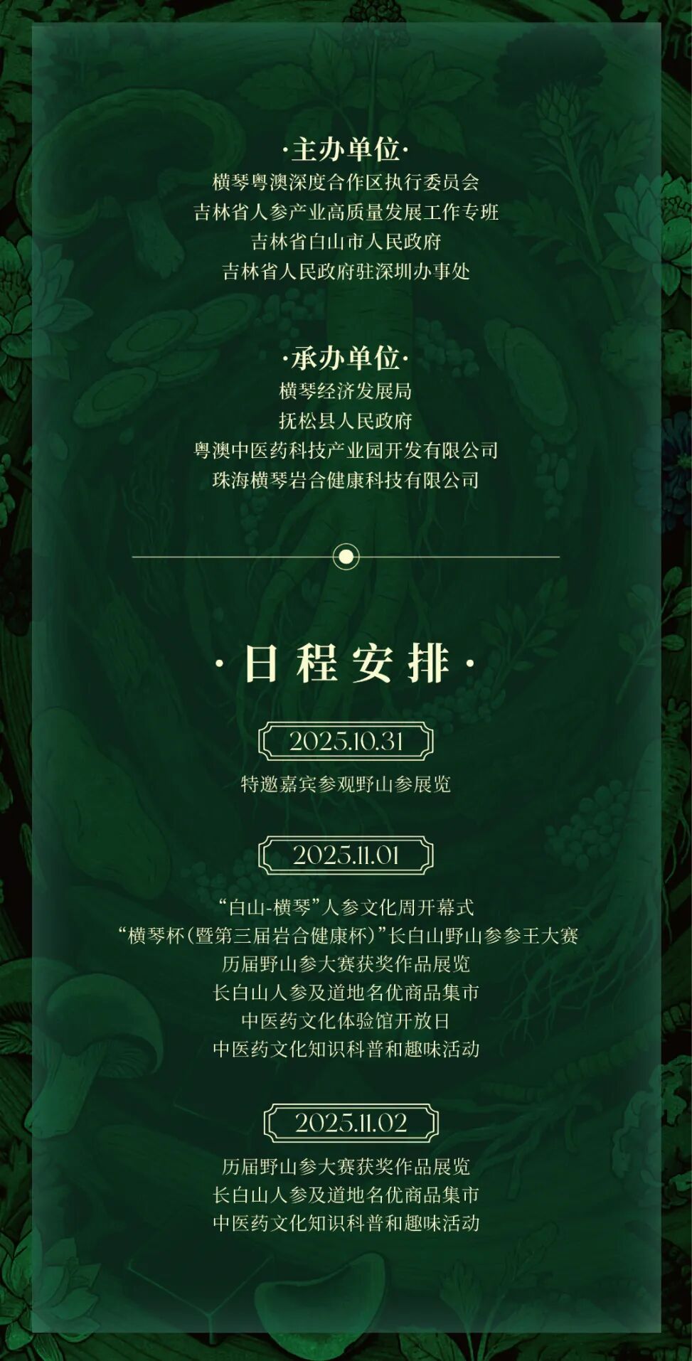 活动设置六大核心板块,涵盖“白山-横琴”人参文化周开幕式、“横琴杯(暨第三届岩合健康杯)”长白山野山参参王大赛、历届野山参大赛获奖作品展览、长白山人参及道地名优商品集市、中医药文化体验馆开放日、中医药文化知识科普和趣味活动。