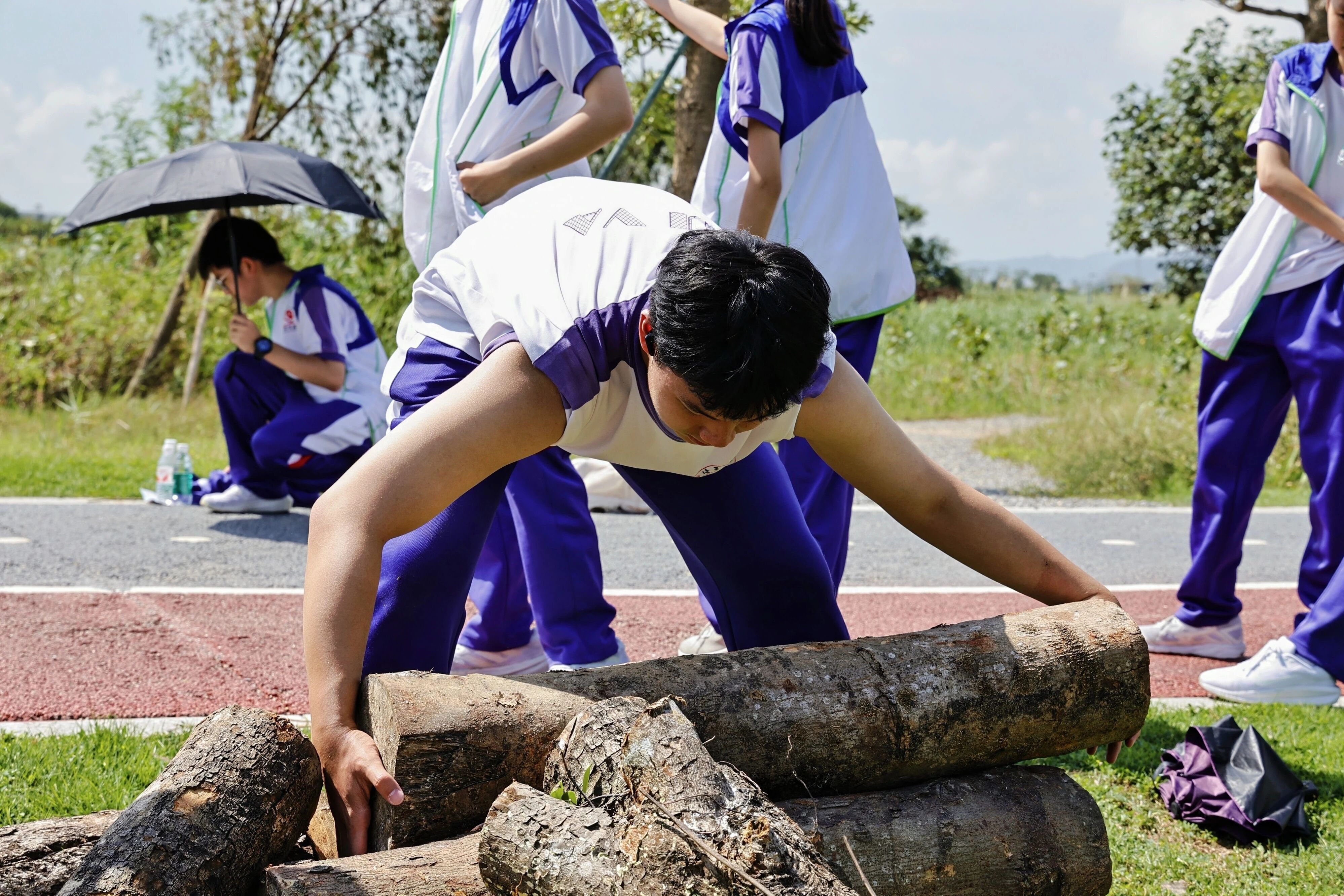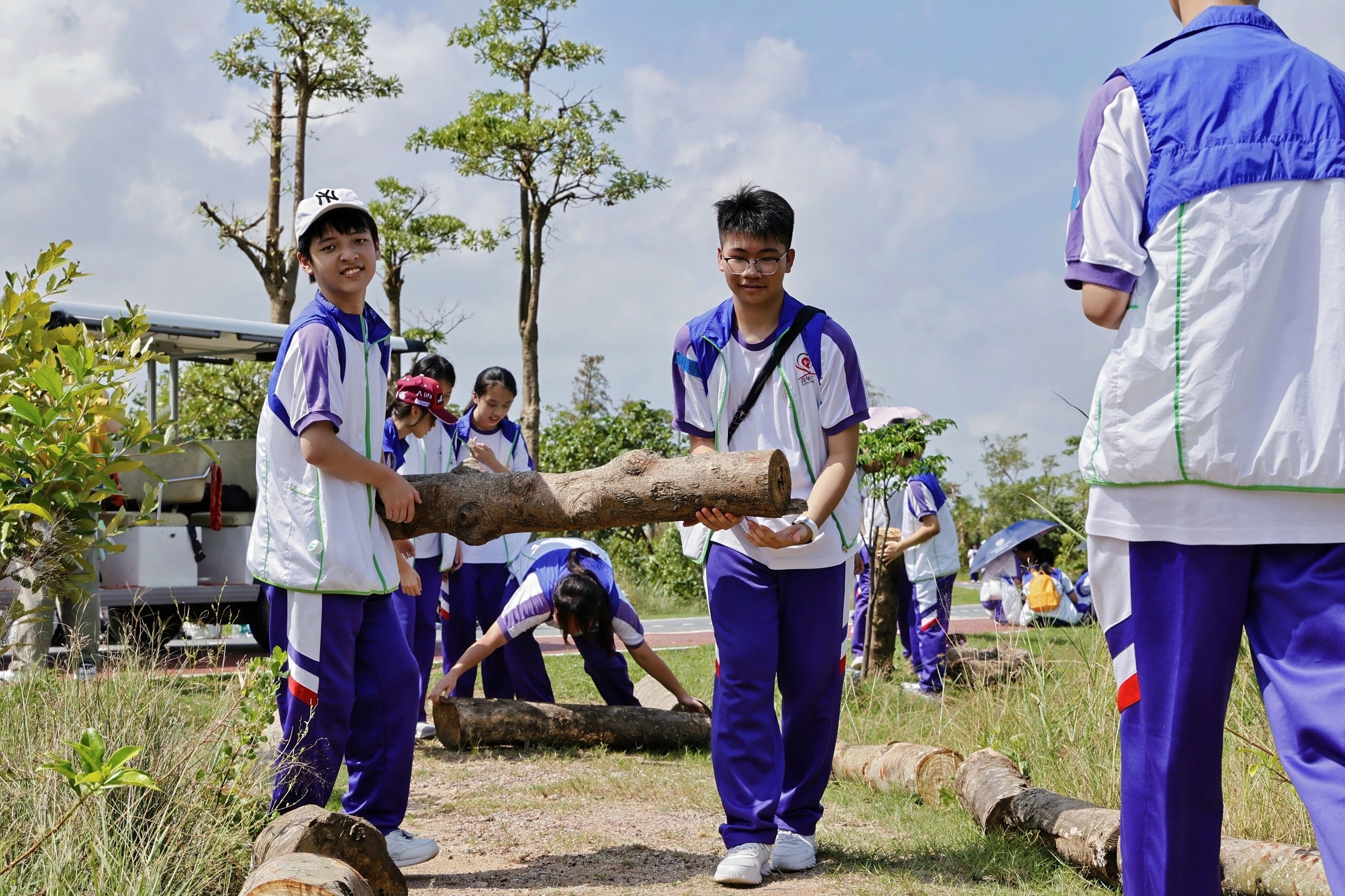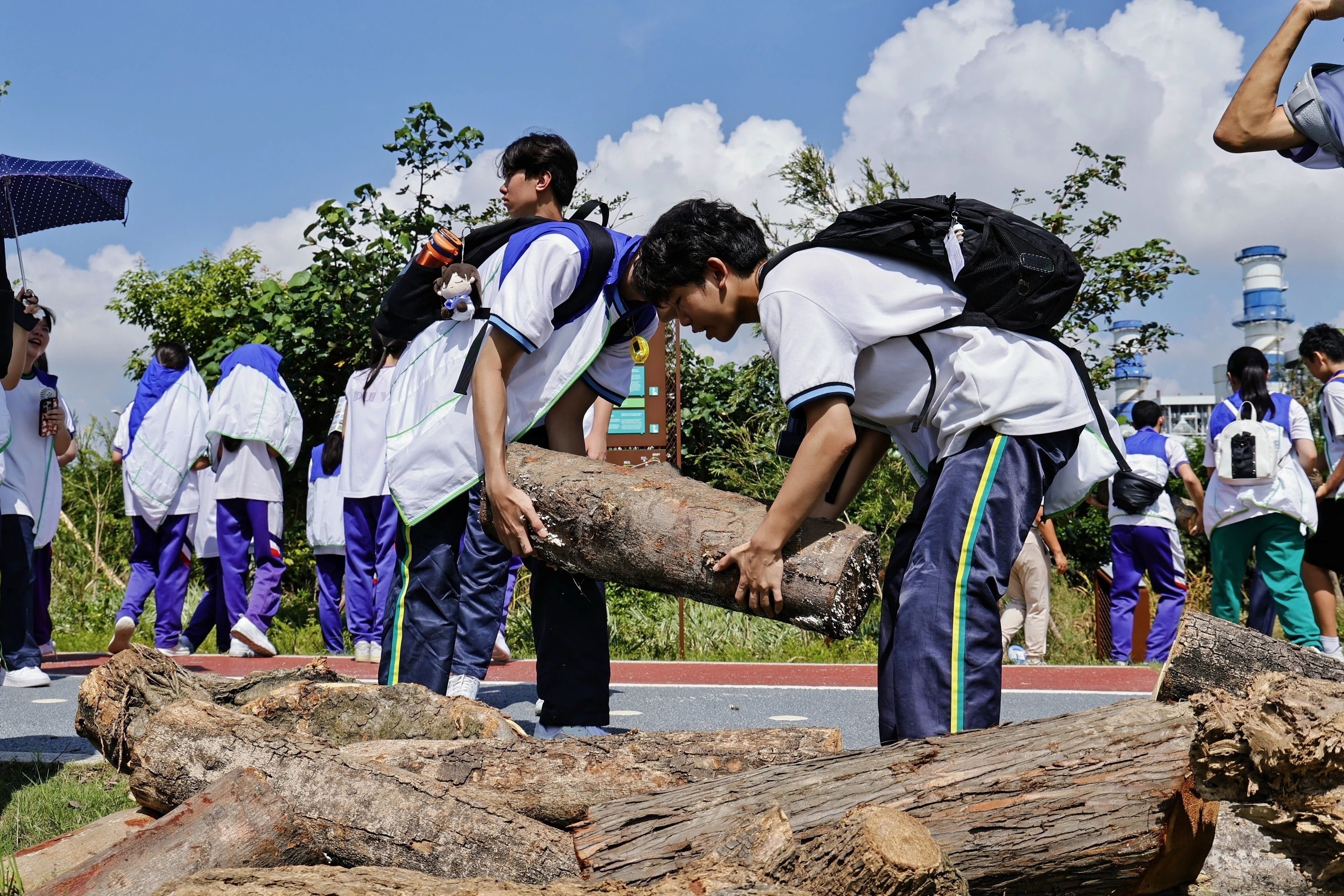 活动当天,同学们把切割后的枯树与漂浮木巧妙安置在亲水小径与科普路旁,模拟“随意”“散落”“自然”的生境。这些看似杂乱的横木,实则是为湿地生物精心准备的栖息之所。