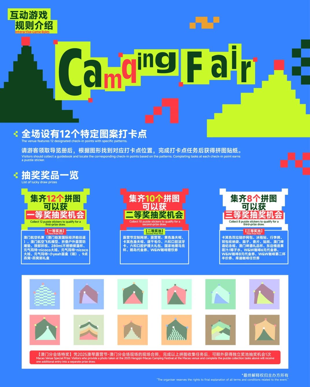 届时,游客朋友们可按提示探索澳琴露营节的各个区域,收集拼图碎片。完成完整拼图后,可兑换露营椅、飞机模型、IP周边等精美礼品,更有幸运者有机会获得澳门航空提供的往返机票大奖。