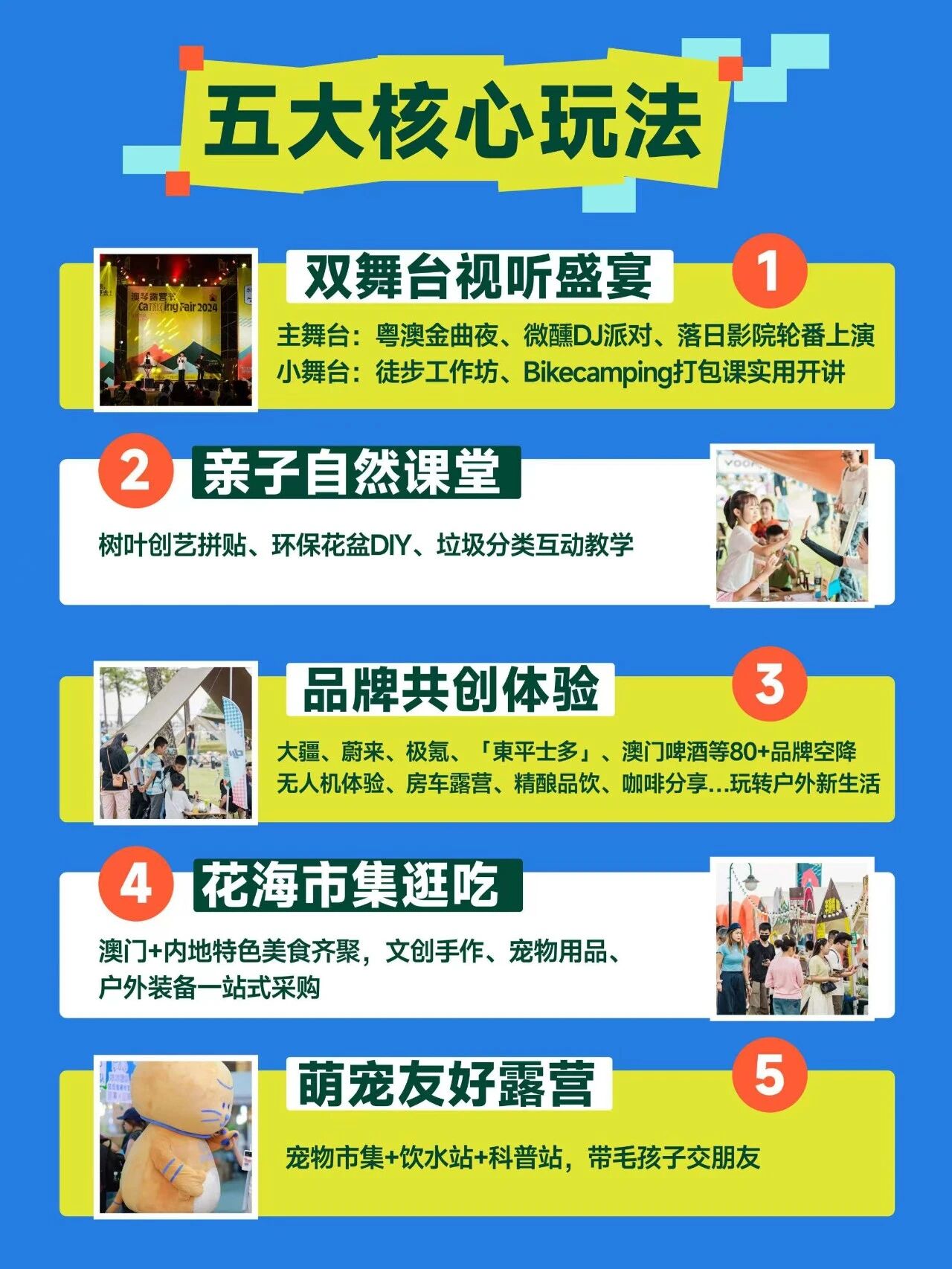 本届澳琴露营节精心规划五大核心玩法,遍布各个主题区域,从丰富有趣的双舞台视听盛宴、干货满满的亲子自然课堂、沉浸式的品牌共创体验,到创意纷呈的花海市集逛吃,乃至专属宠物的萌宠友好露营,玩法多样,精彩不断。