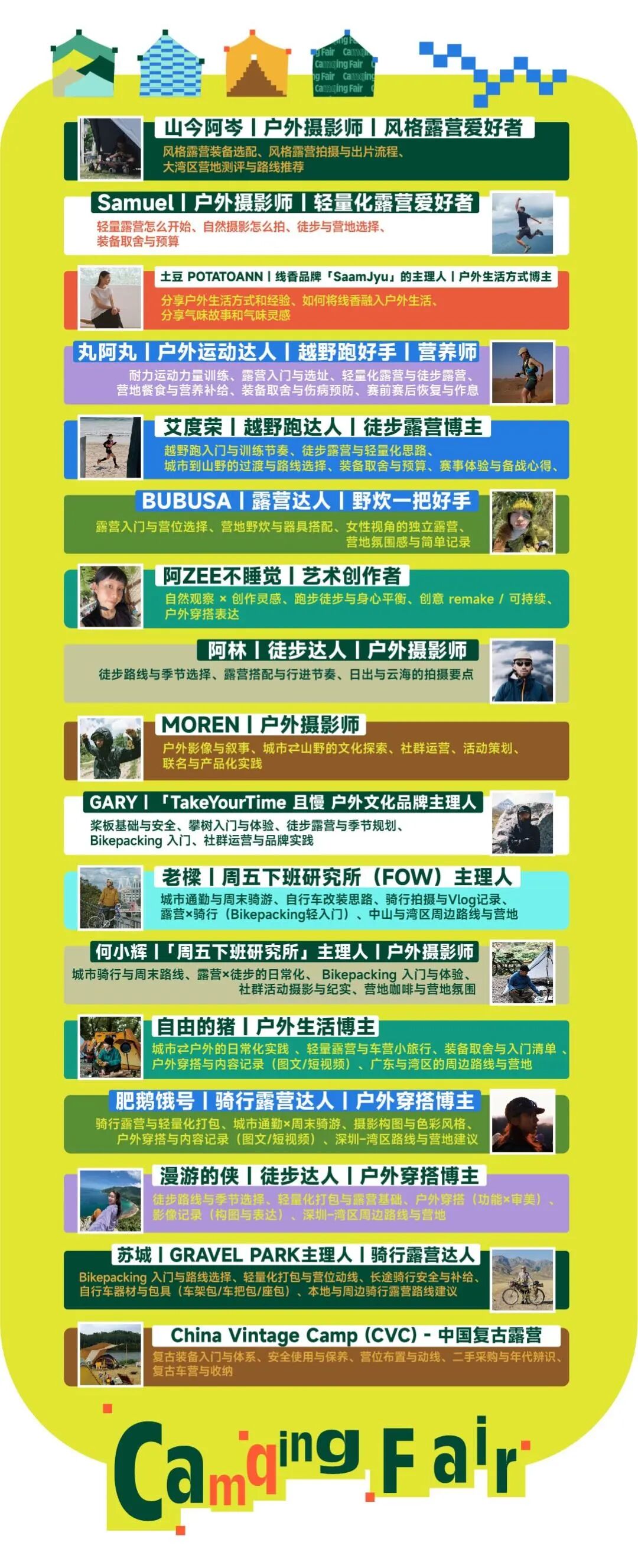 为了丰富游客体验,本届澳琴露营节还邀请了17位户外领域专业玩家,将围绕户外摄影技巧、野外生存技能、大湾区精品露营路线等主题开展分享,游客朋友们可面对面与自身玩家交流心得,获取第一手户外经验。