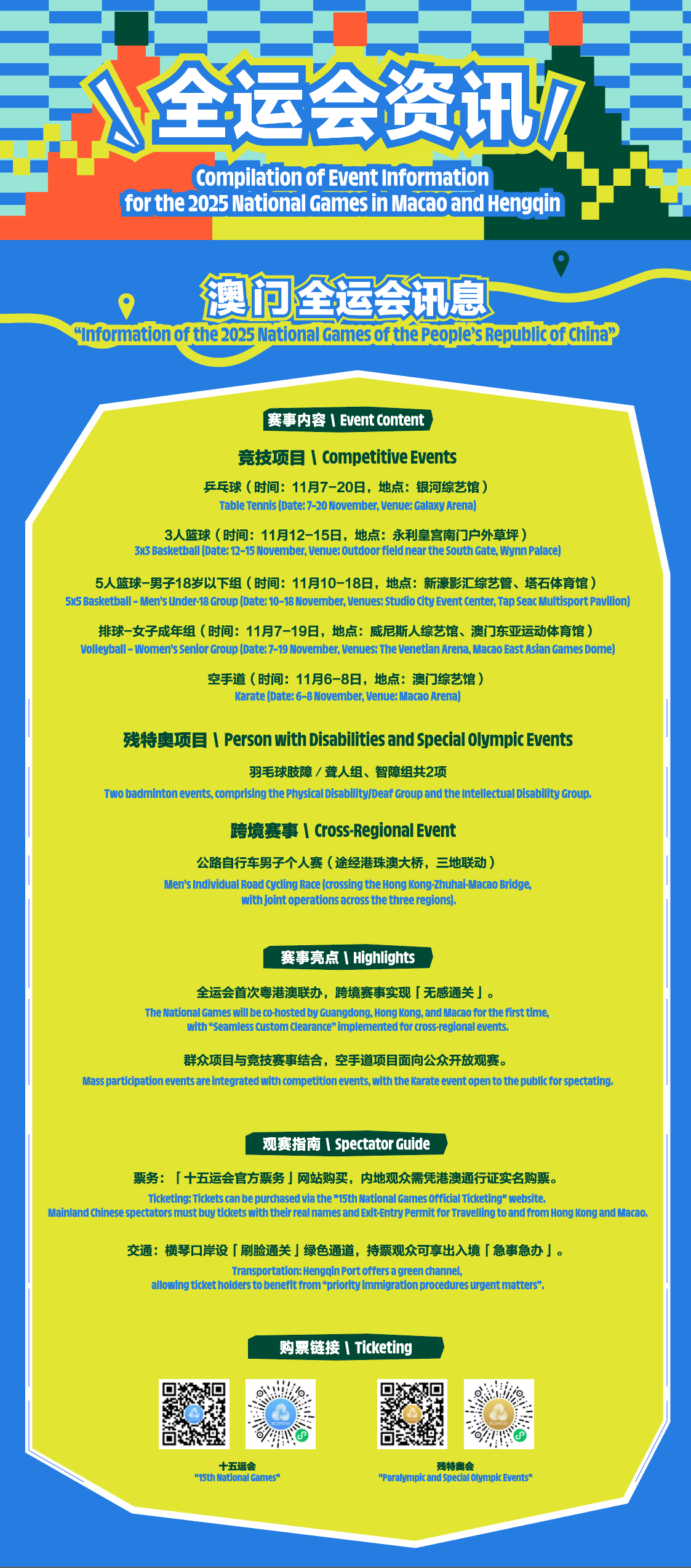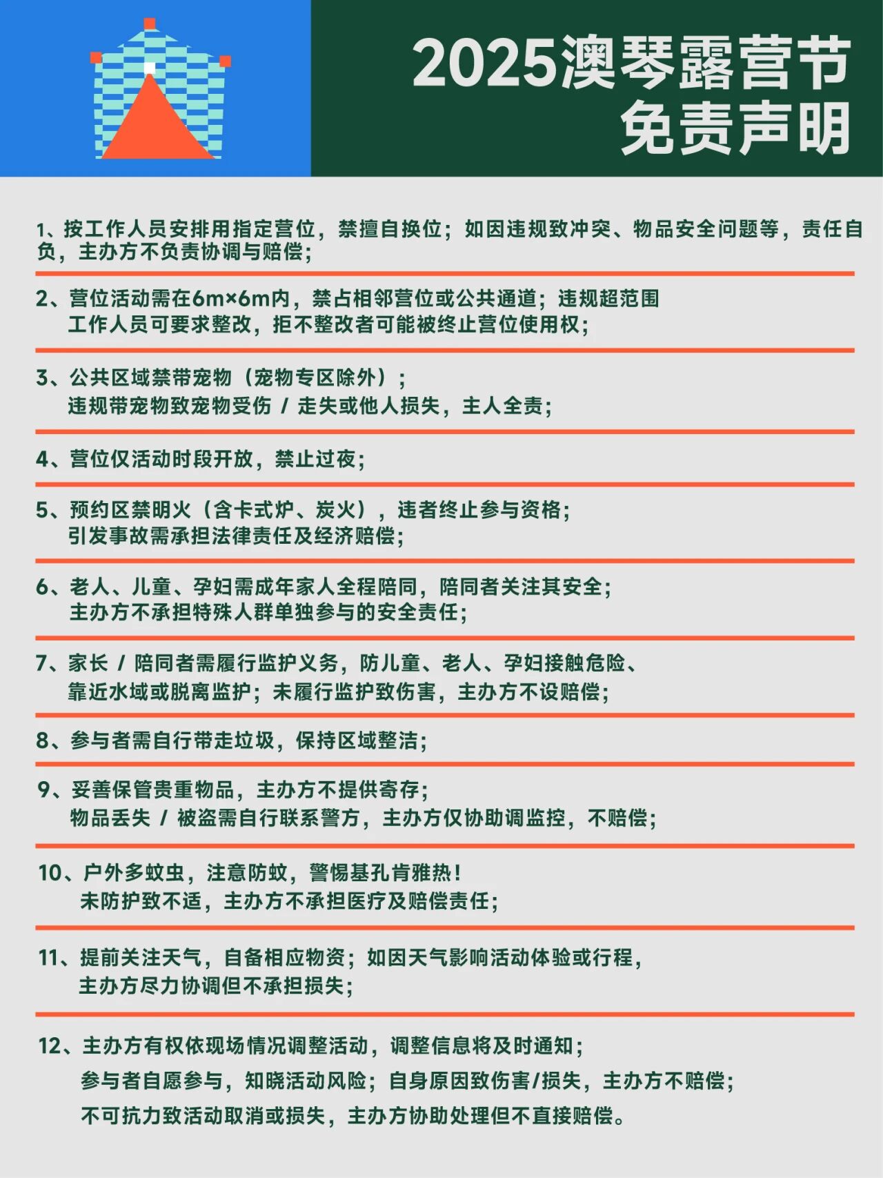 10月25日至26日,由横琴粤澳深度合作区经济发展局与澳门特区政府旅游局联合主办的2025澳琴露营节将在横琴花海长廊精彩启幕。本届澳琴露营节以“自然悠趣,玩野去”为主题,坐拥超7000平方米开阔营地,所有活动均向公众免费开放。(注:公众营位需提前预约)