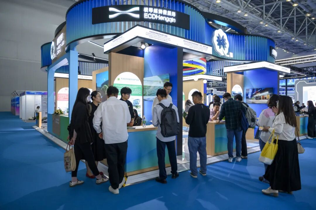 “横琴展区”以“产业聚能,活力横琴”为主题,运用蓝绿渐变的环形格栅构建出富有层次的展示空间,结合多媒体互动展台与专业洽谈区,兼顾产品展示与商务交流功能,生动诠释横琴作为粤港澳大湾区服务贸易枢纽的重要平台,同时,集中展示合作区“四新”产业的发展态势,展现制度创新与产业集聚方面的潜力。