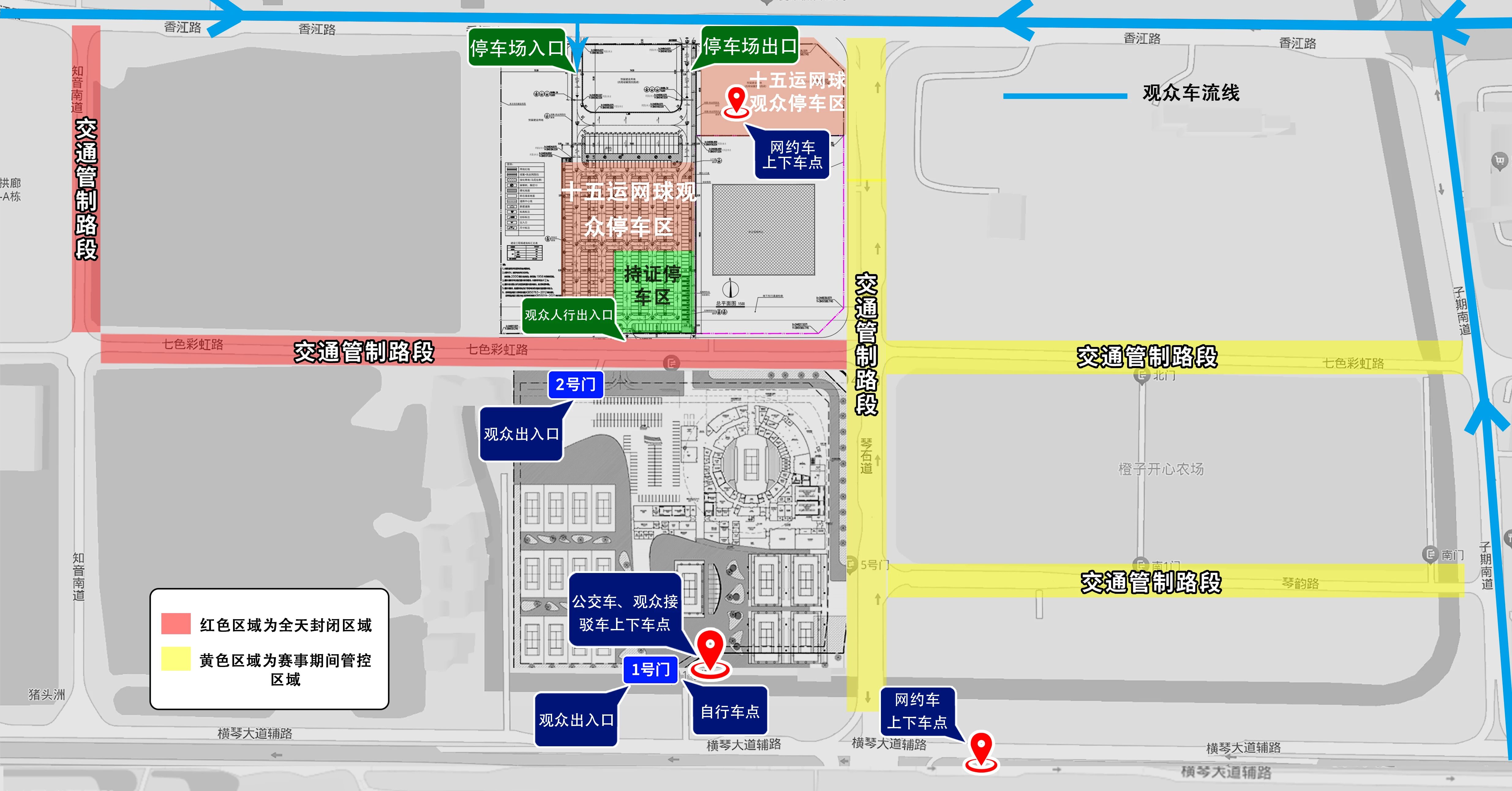 (1)横琴岛外车辆:①十字门隧道→荣粤道→琴海东路→濠江路跨线桥→子期道→香江路→观众停车场;②横琴隧道→中心大道→港澳大道→天羽道→香江路→观众停车场;③横琴二桥→横琴大道→天羽道→香江路→观众停车场;