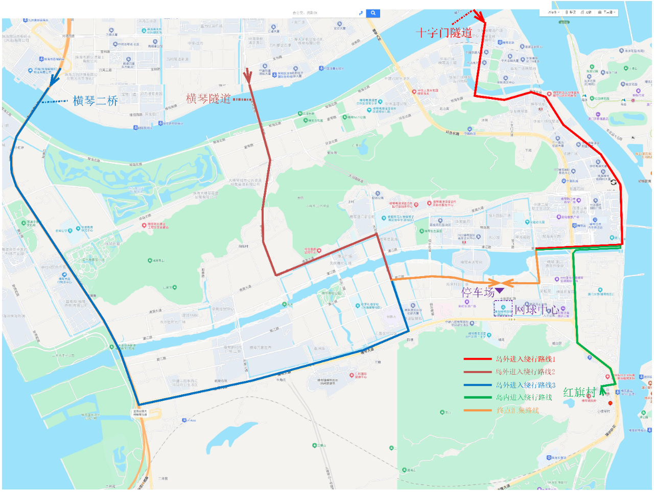 (2)横琴岛内车辆:红旗村→环岛东路→濠江路→掉头→濠江路跨线桥→子期道→香江路→观众停车场。