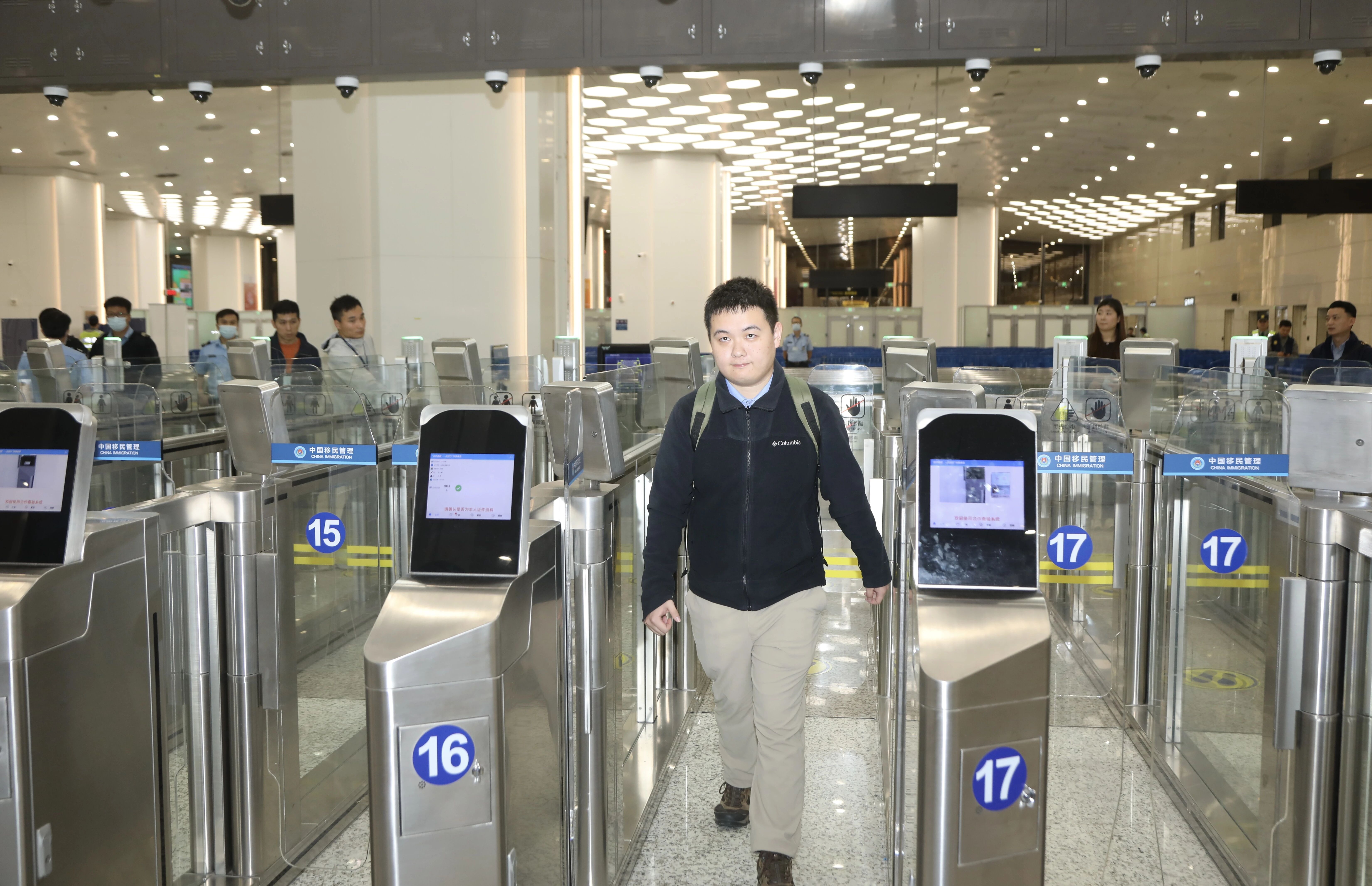 11月5日凌晨刚过,横琴口岸就迎来了当天第一批通关旅客,不少旅客正在有序通关。“我刚下晚课,在学校吃了点宵夜,刚刚使用这个通道感觉非常‘丝滑’。我的手就按了一下指纹,全程十几秒就搞定了。”横琴口岸入境旅检大厅内,首位经合作智能快捷通道“刷脸”通关的澳门城市大学韦同学分享了自己的通关体验。