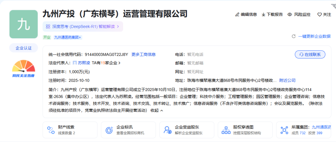 近日,九州产投(广东横琴)运营管理有限公司成立,法定代表人为苏熙凌,注册资本1000万元,经营范围包含企业管理;科技中介服务;工程管理服务;园区管理服务;企业管理咨询;信息技术咨询服务等。股权穿透显示,该公司由九州通(600998)间接全资持股。