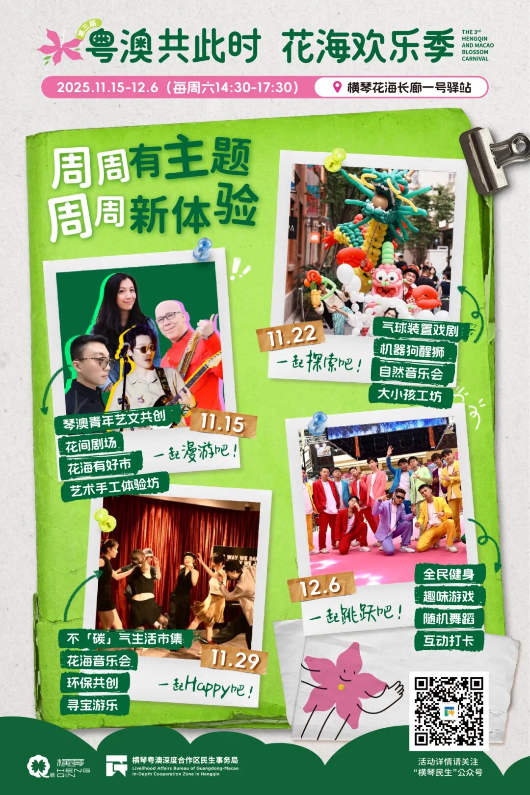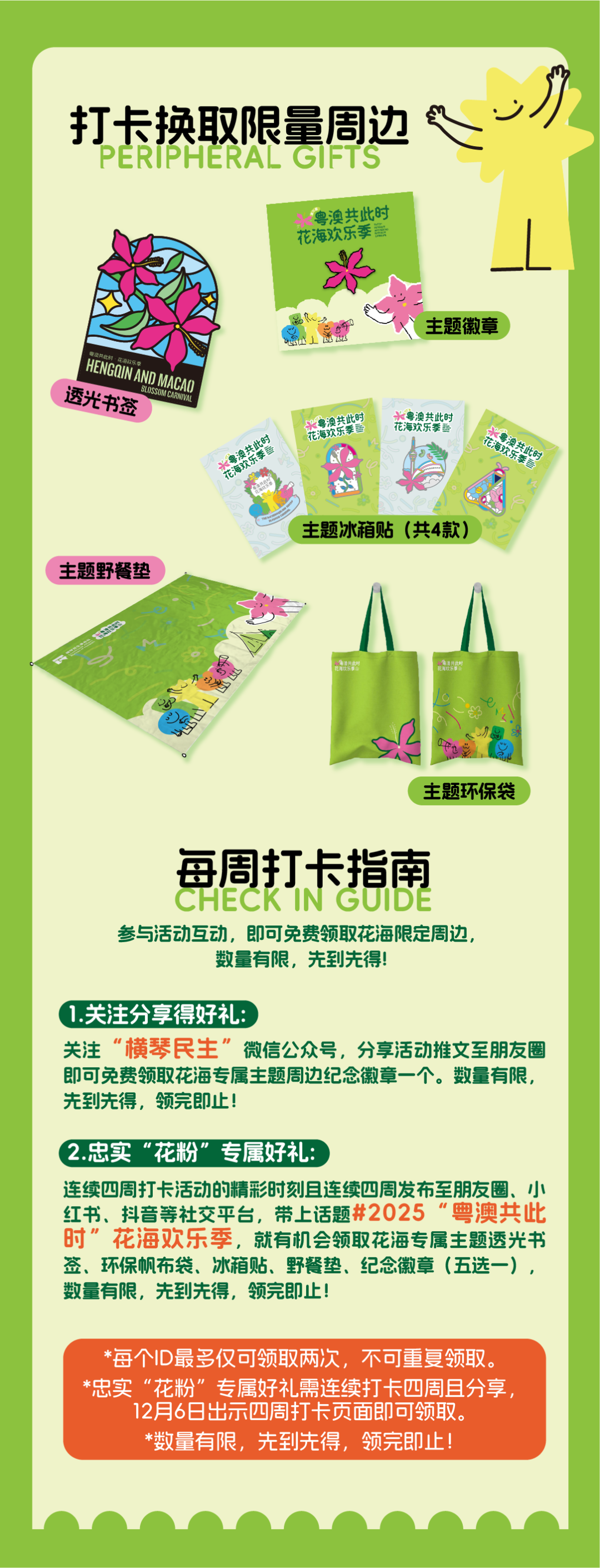 为增强活动的持续吸引力,本届活动特别设置“花海集章打卡”环节。参与者完成各周主题任务,即可兑换限定纪念品,使每一次互动成为独特记忆,亦成为琴澳情谊的生动见证。
