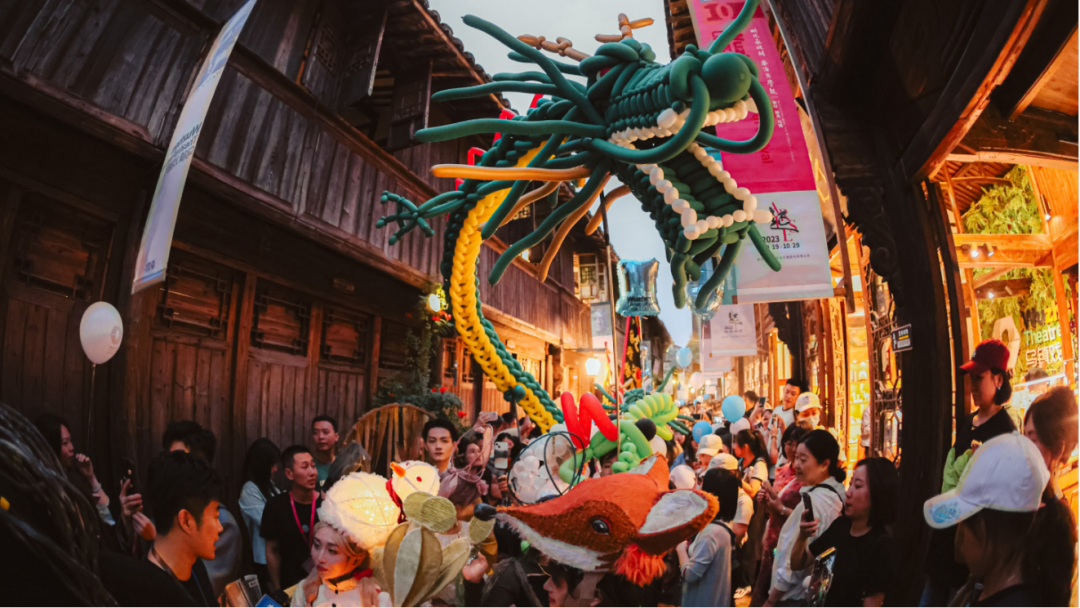 11月22日第二周主题为“来花海·一起探索吧”,聚焦“自然与探索”,以科技与艺术结合的互动形式,打造沉浸式亲子体验。气球装置玩偶剧《哈!似龙》打破舞台界限,构建奇幻气球世界;“机器狗醒狮”则以赛博舞狮演绎传统非遗,展现科技赋能文化的创新表达。