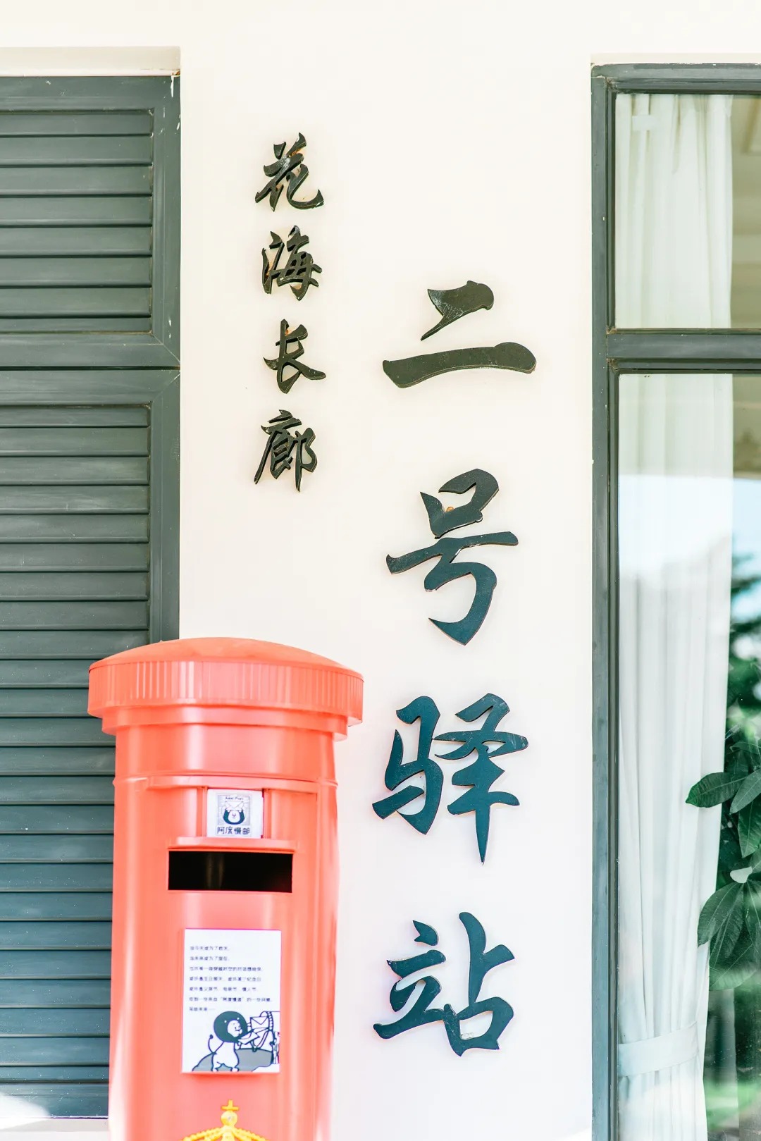 花海长廊二号驿站为欧式灯塔建筑,设有巨型邮筒、书吧以及时尚茶饮店,营造轻松慢时光悦读氛围。