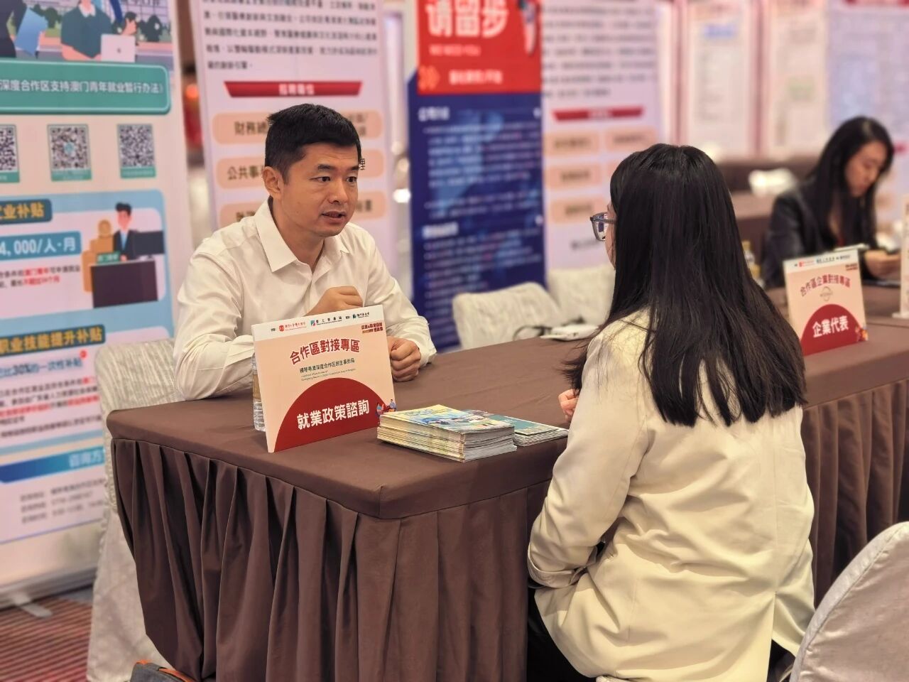 为进一步服务有意在合作区求职的澳门青年,活动现场设置“合作区政策咨询专区”,提供一对一咨询,重点推介合作区支持澳门青年就业补贴、人才生活补贴等相关政策,并介绍“澳门居民招聘专区”“广东公共求职招聘服务平台”等线上招聘渠道,推动“线上+线下”服务融合。