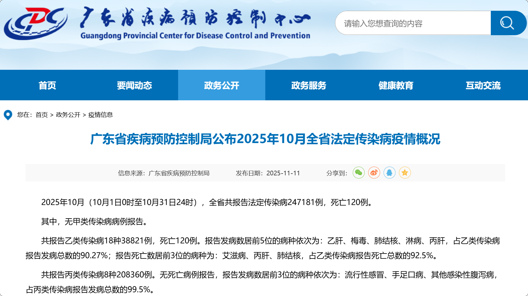 据广东省疾病预防控制局消息,2025年10月(10月1日0时至10月31日24时),共报告丙类传染病8种208360例,无死亡病例报告。报告发病数居前3位的病种依次为:流行性感冒、手足口病、其他感染性腹泻病,占丙类传染病报告发病总数的99.5%。其中,流行性感冒共报告121149例。