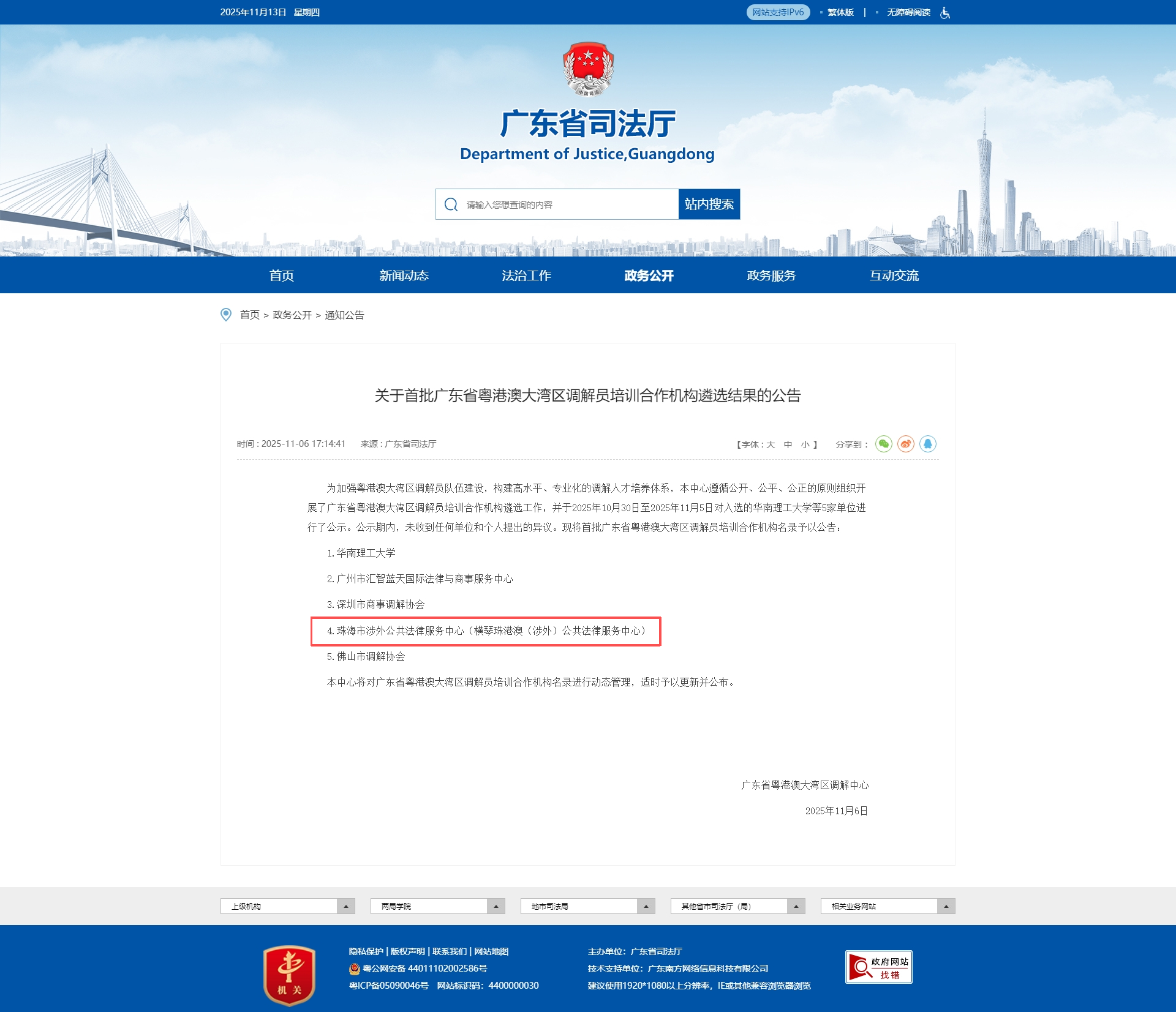 11月6日,广东省粤港澳大湾区调解中心发布《关于首批广东省粤港澳大湾区调解员培训合作机构遴选结果的公告》。