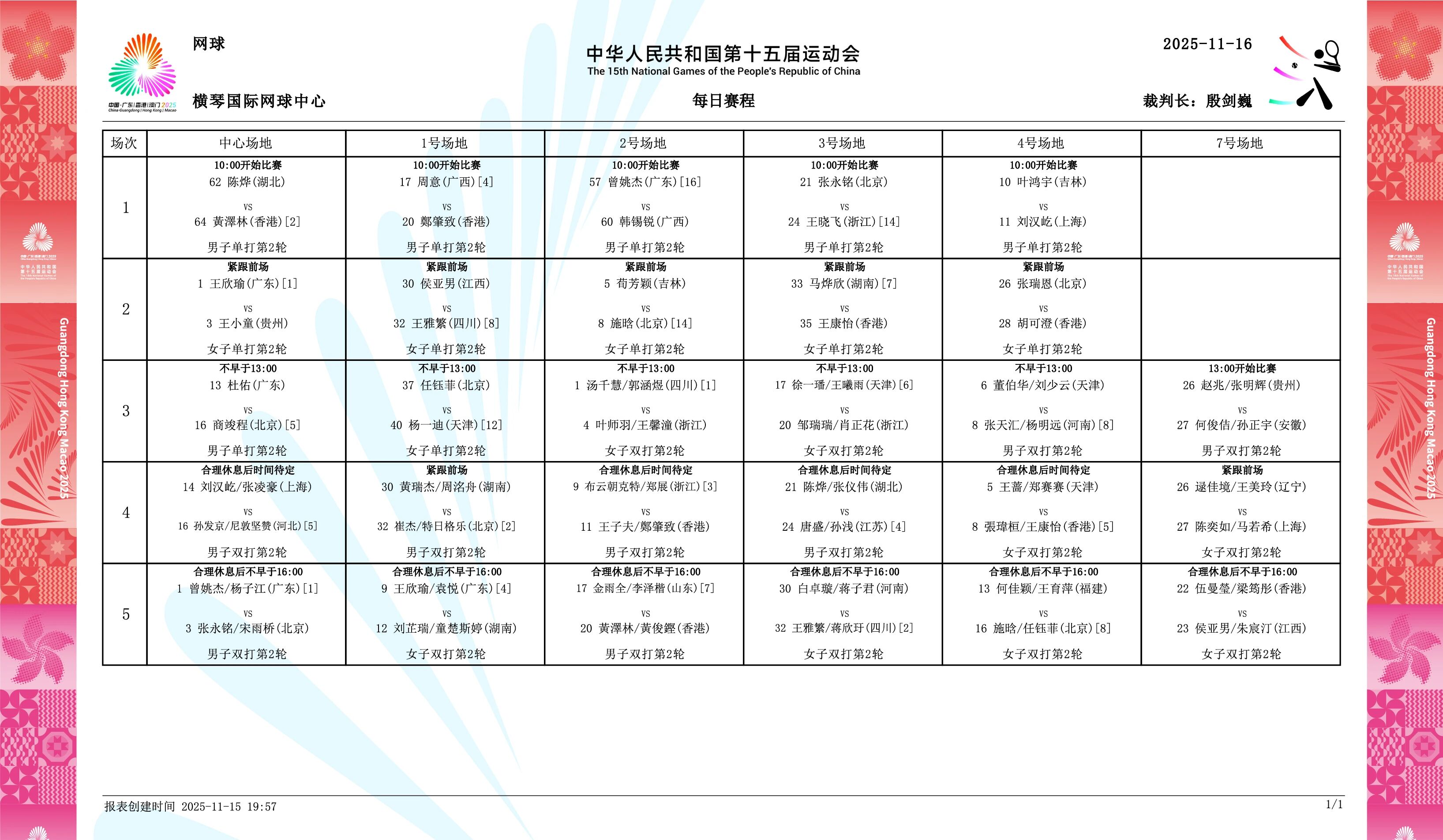 11月16日,十五运会网球比赛将继续单双打第二轮的争夺。黄泽林、王欣瑜、商竣程依次亮相中心场,周意、王雅繁则会在1号场登场。