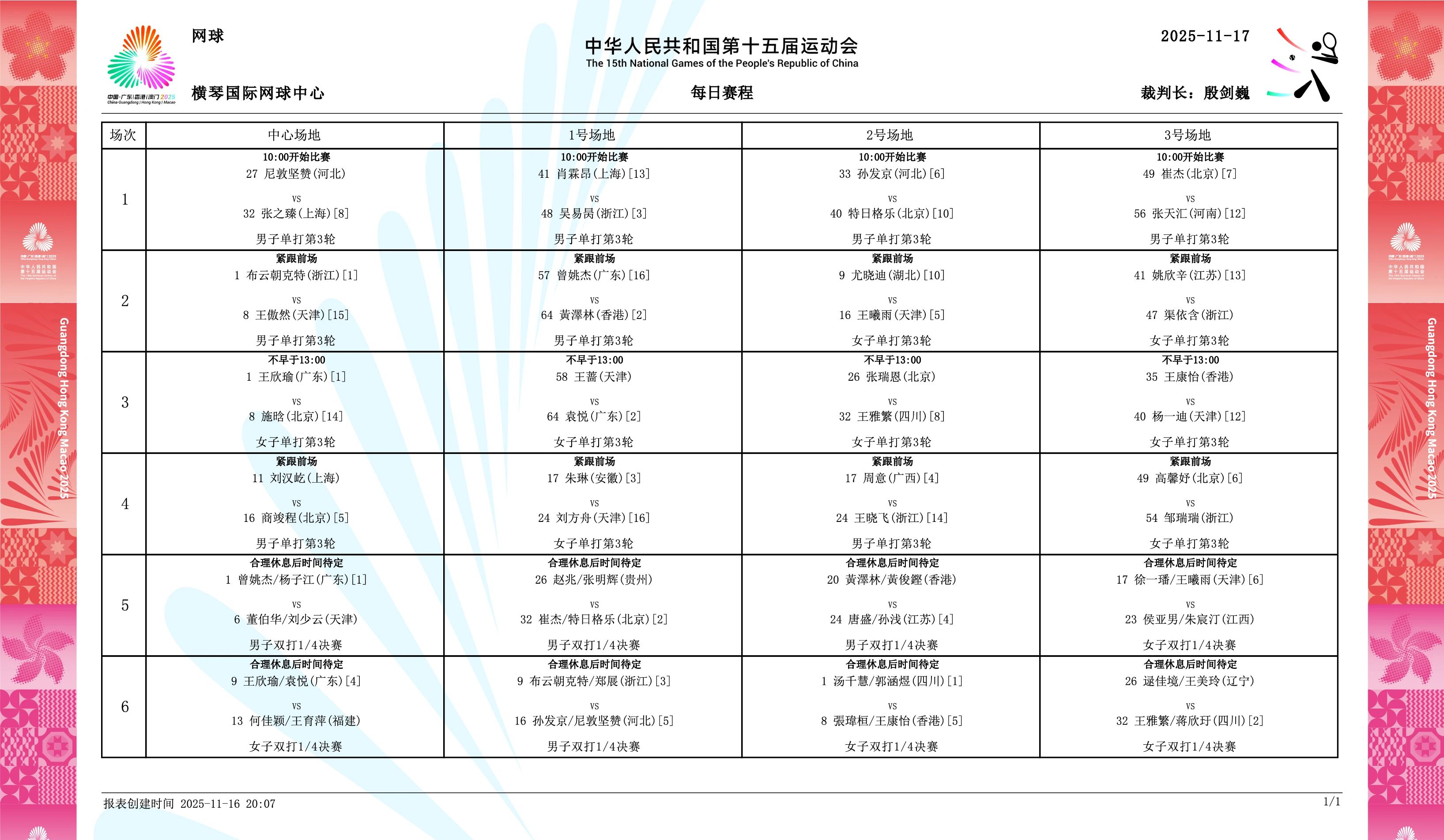 11月17日,十五运会网球比赛将展开单打第三轮、双打四分之一决赛的争夺。