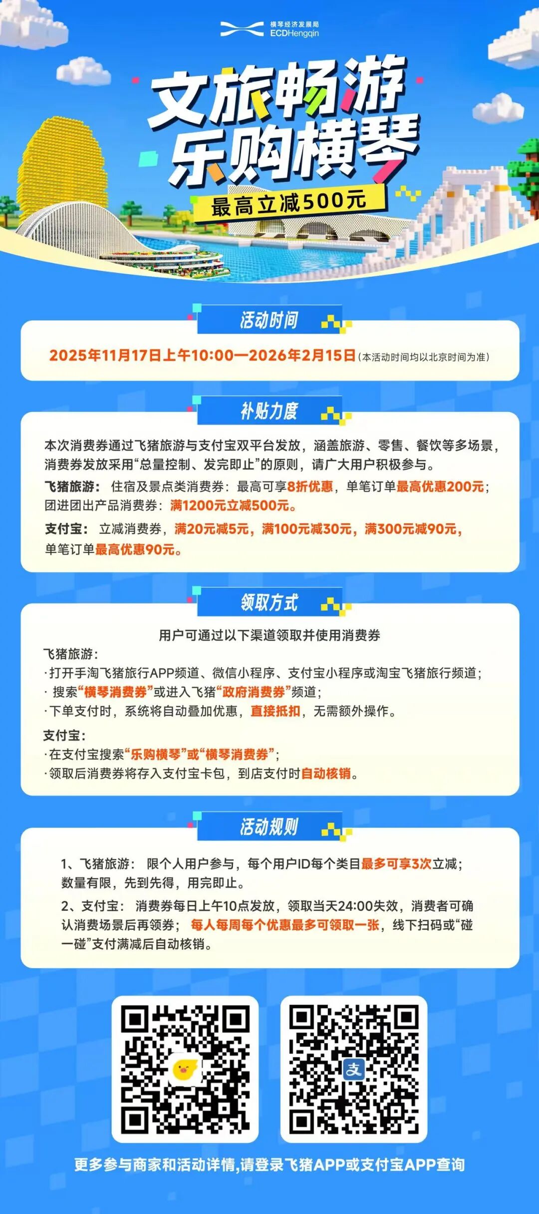 “文旅畅游·乐购横琴”消费券活动即日起正式启动,活动将持续到明年2月15日。从2025年11月17日开始,每天上午10点起,消费者均可通过“飞猪旅游”APP或“支付宝”APP领取消费券,最高可优惠500元,名额有限,领完即止。