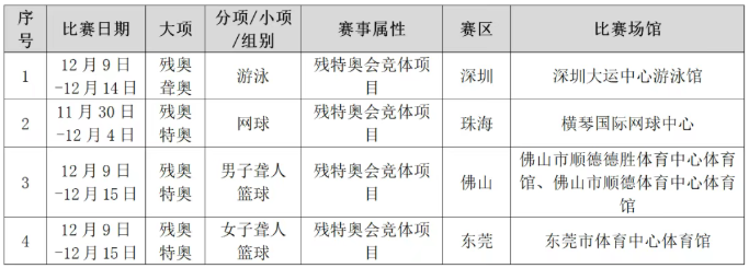 2025年11月18日10时起,全国第十二届残疾人运动会暨第九届特殊奥林匹克运动会(以下简称残特奥会)体育比赛门票将正式面向公众开售。本阶段将开售4个竞体项目,包括残奥聋奥的游泳、网球、男子聋人篮球和女子聋人篮球赛事,将分别在深圳、珠海、佛山和东莞举行。