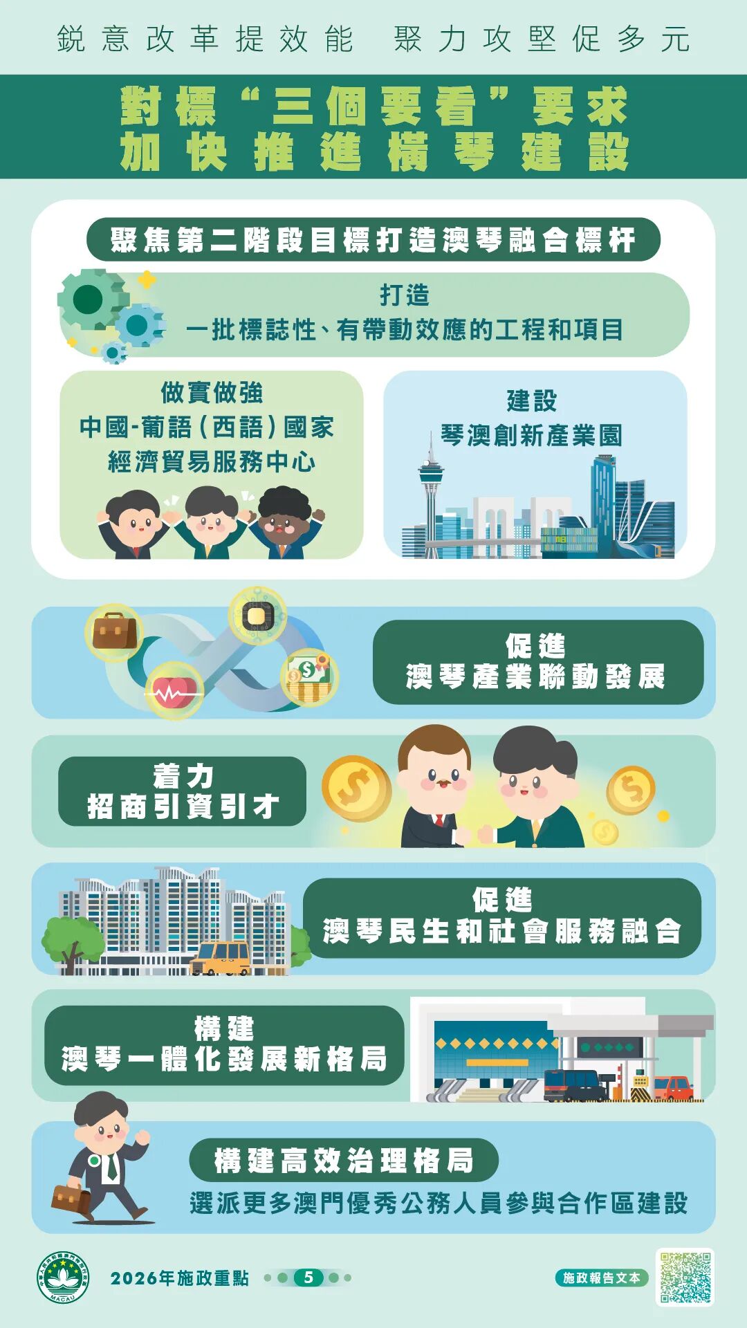 值得关注的是,这是岑浩辉就任后第二份施政报告,其中明确将“横琴合作区建设取得新进展,澳琴一体化进一步加强”列为2026年澳门特区政府主要施政目标之一,并将“对标‘三个要看’要求,加快推进横琴建设”单列成章。