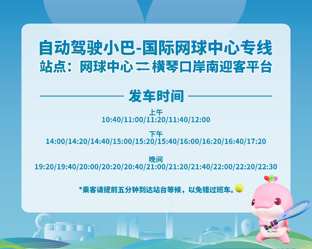 11月10日开通横琴口岸至横琴国际网球中心赛事自动驾驶接驳专线,往返比赛场馆的直通线路,获得市民游客的热烈反响,也为参赛人员、工作人员及观赛群众提供更加便捷的出行选择。