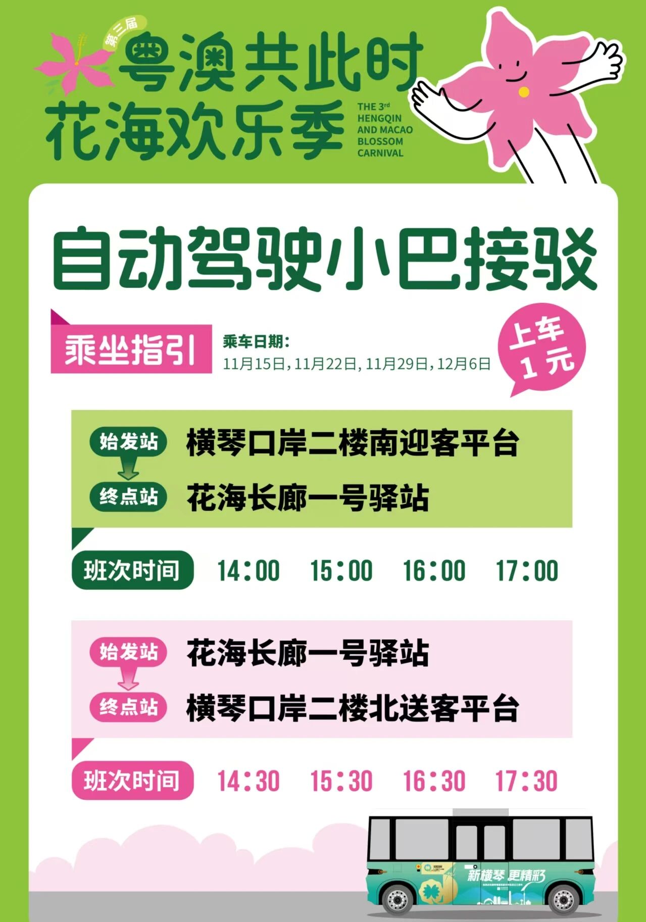为保障花海欢乐季活动顺利举办,合作区城市规划和建设局于11月15日开通横琴口岸至花海长廊一号驿站自动驾驶临时接驳专线,一站直达的接驳服务,为市民游客花海之旅提供高效、便捷的交通出行体验。
