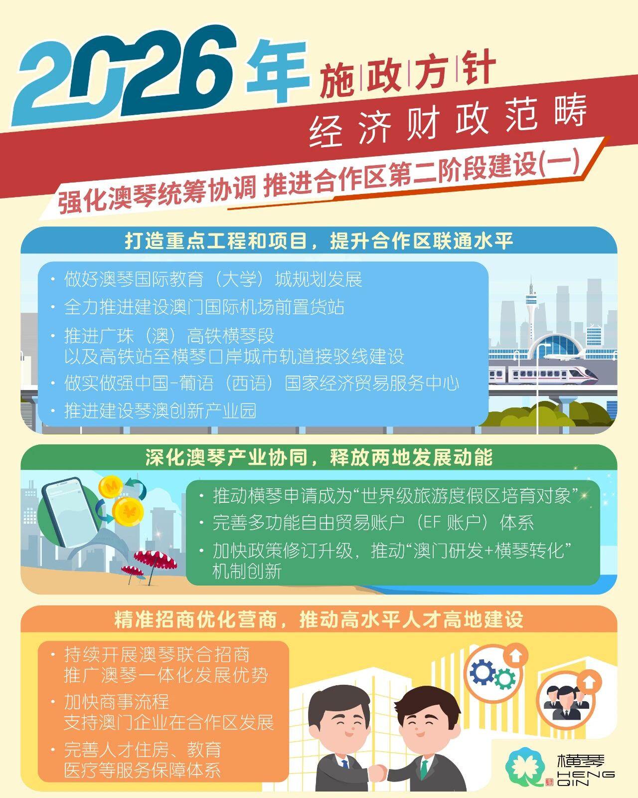 2026年将重点做好澳琴国际教育(大学)城一期的各项筹备工作,全力推进澳门国际机场前置货站项目建设,推进广珠(澳)高铁横琴段以及高铁站至横琴口岸城市轨道接驳线建设。